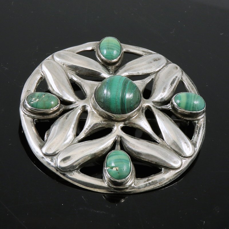 Carl M. Cohr. Skønvirke Broche i Sølv med malakit.