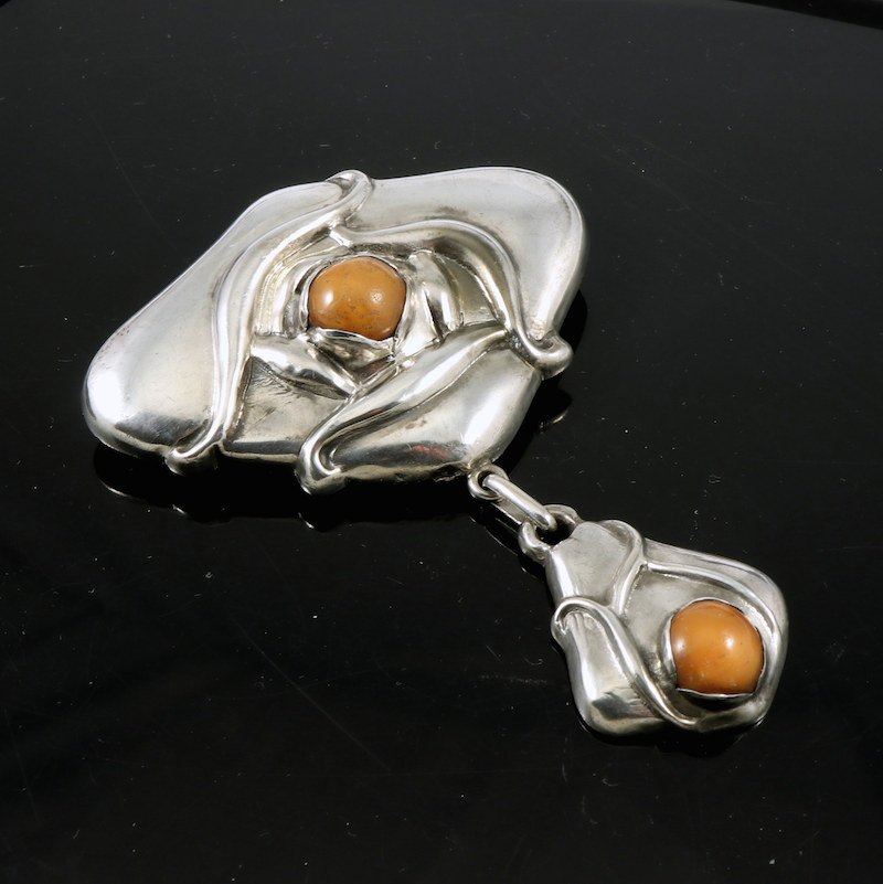 Grann & Laglye. Skønvirke Broche i sølv med rav.