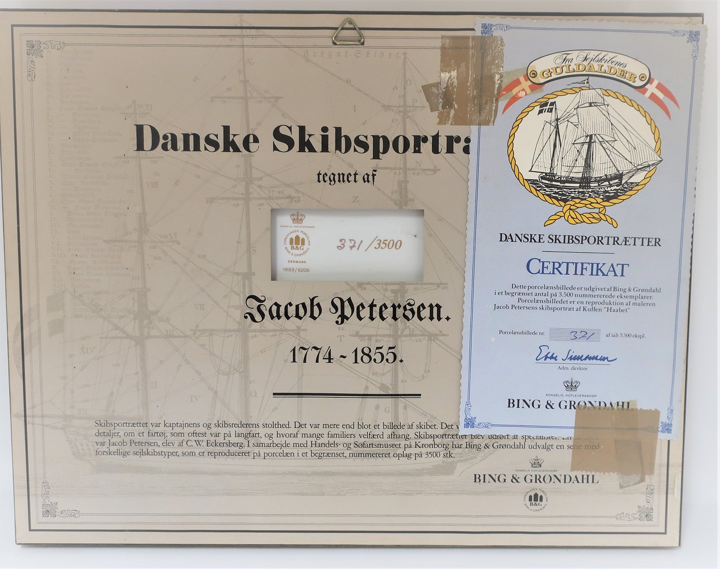Bing & Grøndahl. Porcelæn. Danske skibsportrætter. Billed af "Haabet". Mål : Bredde 38* 30 cm. Der er produceret 3500, og denne er no. 371.