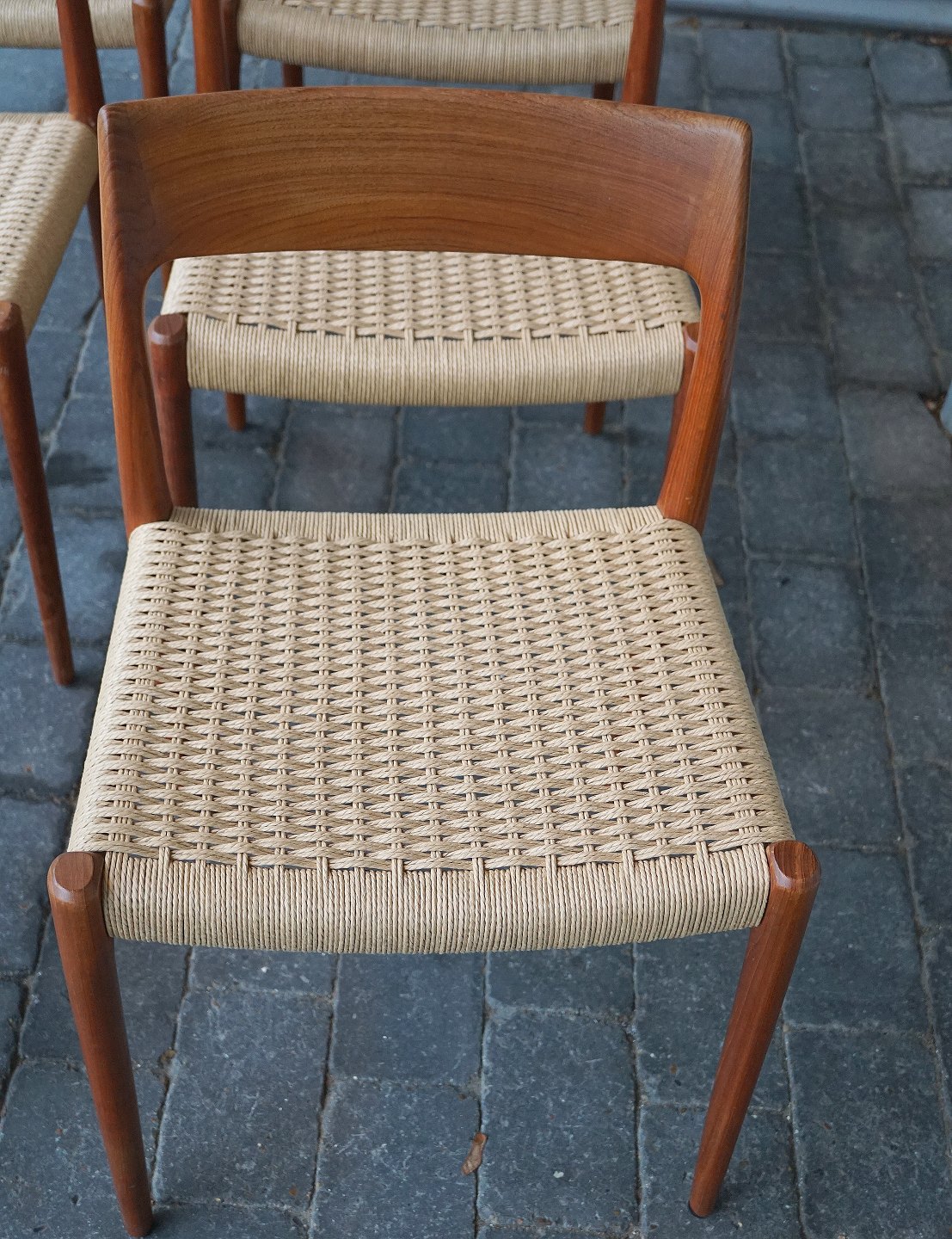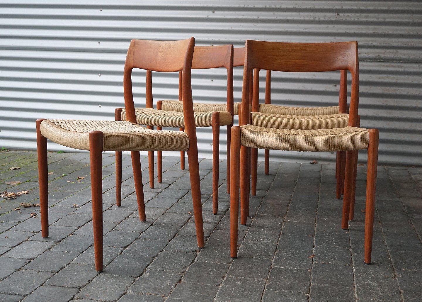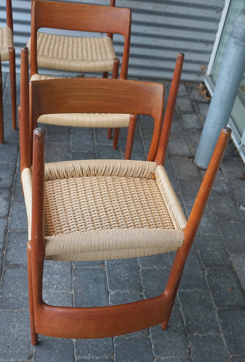 2 spisebordstole, model 77. Stolene er nyrenoveret. Stolene er af teaktræ og med nyflettet sæde af papirgarn