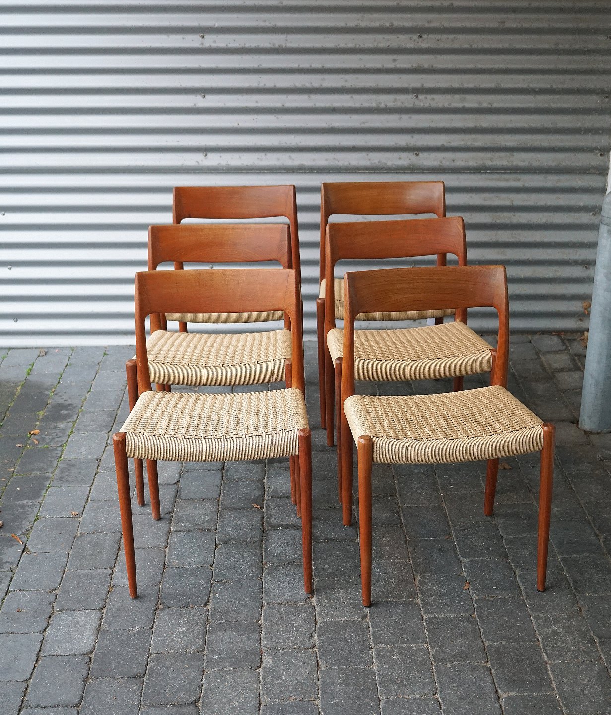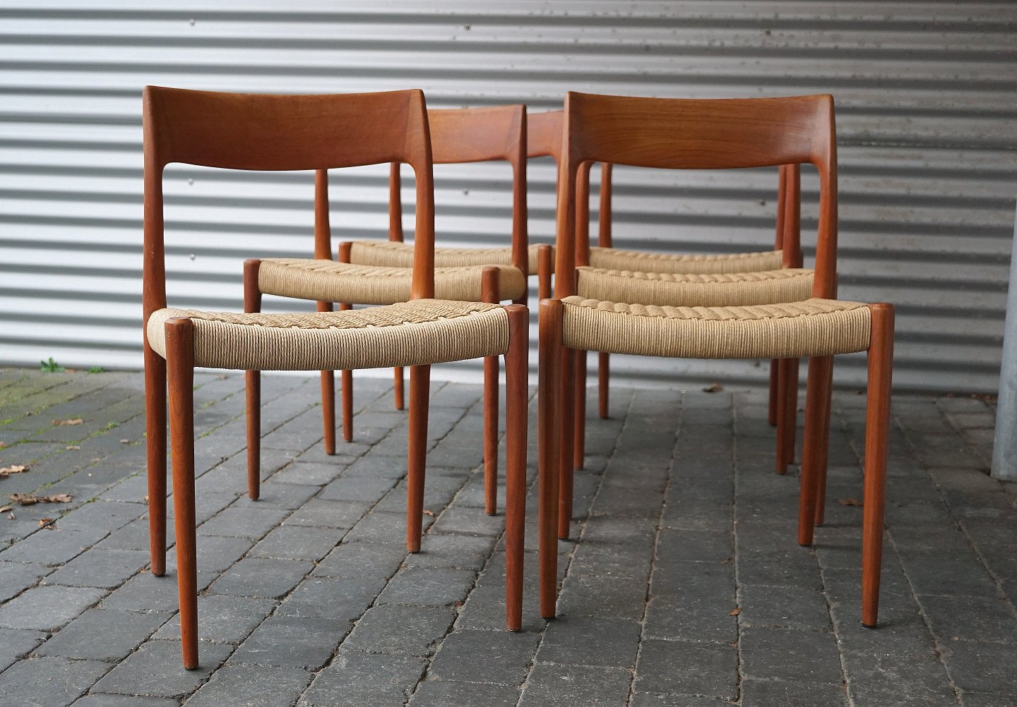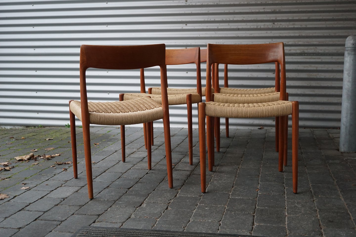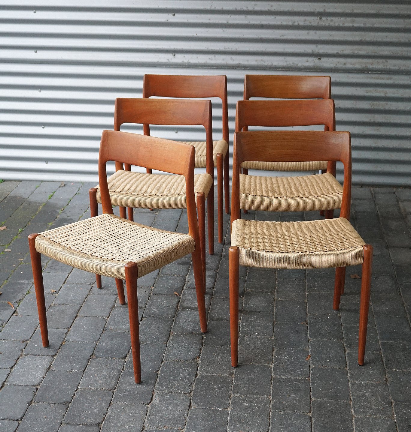 2 spisebordstole, model 77. Stolene er nyrenoveret. Stolene er af teaktræ og med nyflettet sæde af papirgarn