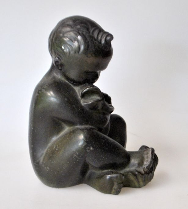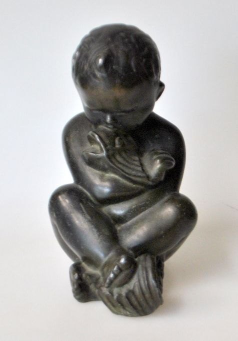 Dansk kunstner (20. årh): En dreng med en fisk. Patineret metal/zink. Signeret.: KJH. H.: 13 cm.