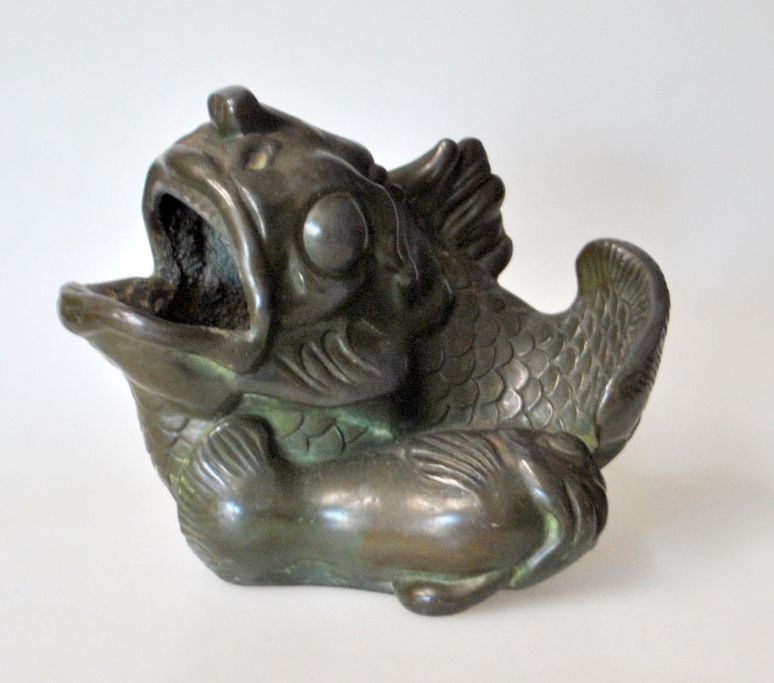 Andersen, Just (1884 - 1943) Danmark. Fiskefigur, vase. No.: 1518. Grønpatineret metal. Stemplet. H.: 11 cm.