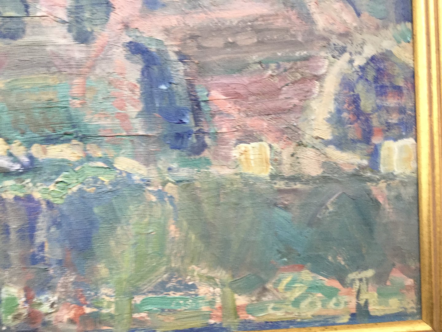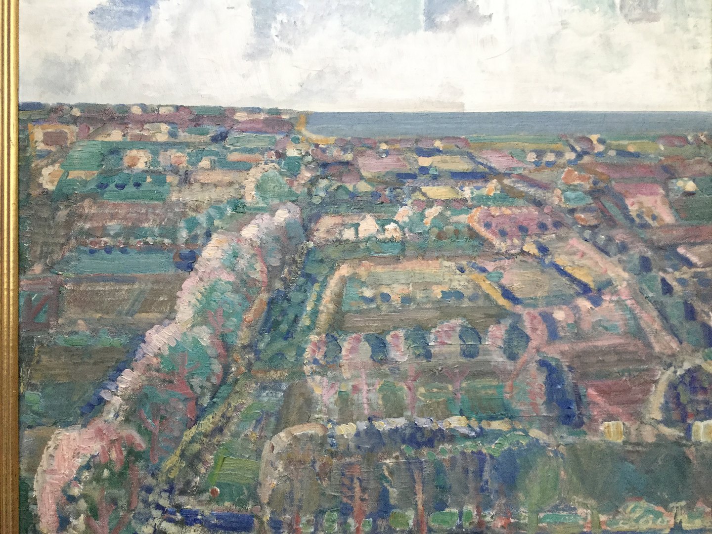 Maleri af Leo Thellefsen - Udsigt ud over by og marker.