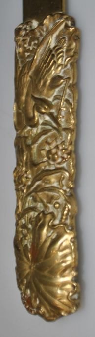 Stor japansk papir kniv i messing, 19. årh. Håndtag dekoreret med traner og bladværk. Blad med fugle og blomster. L.: 36,5 cm.