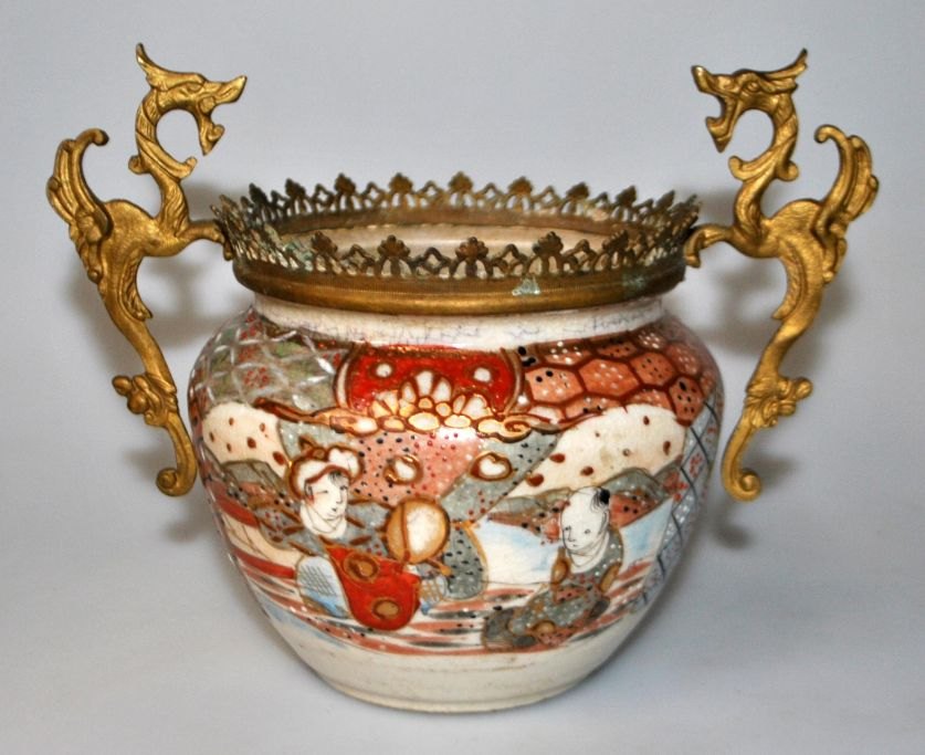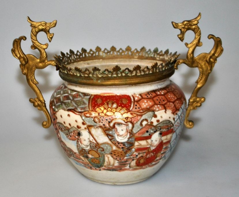 Japanese satsuma jar with bronze mount, 19th century.