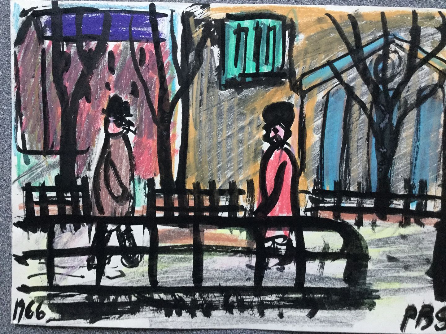 Tegning af Peder Brøndum Sørensen - 2 personer ved huse på vej 1966.