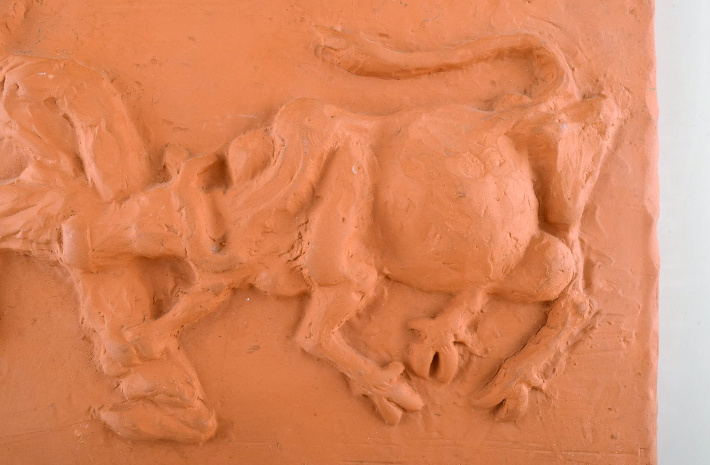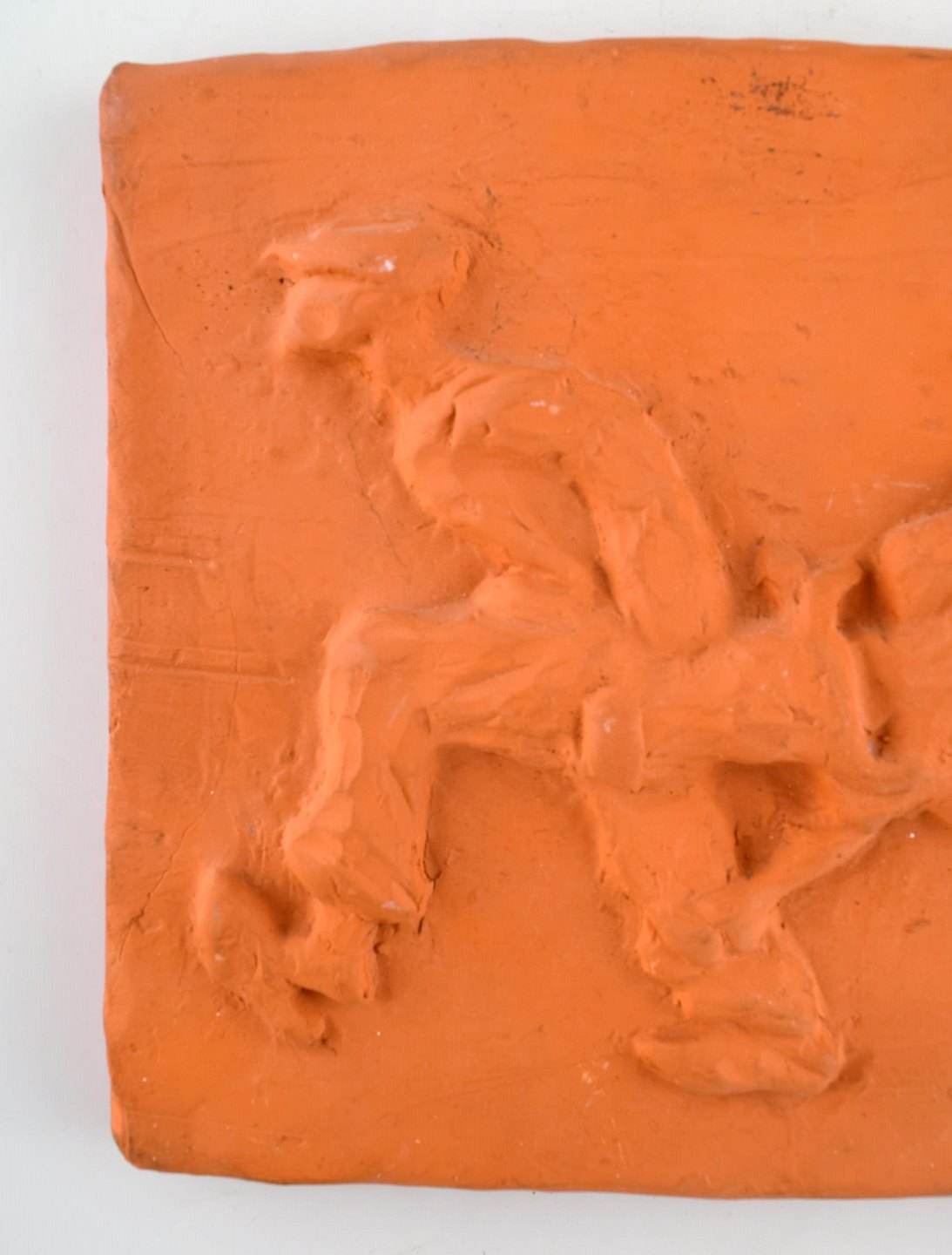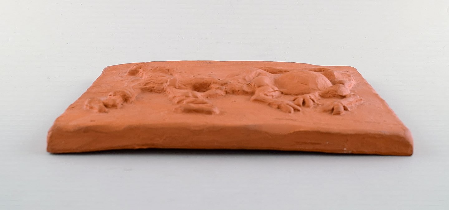 Kloster, Ystad vægplakette i terracotta. Koen drives hjem. Svensk design, 1960'erne.