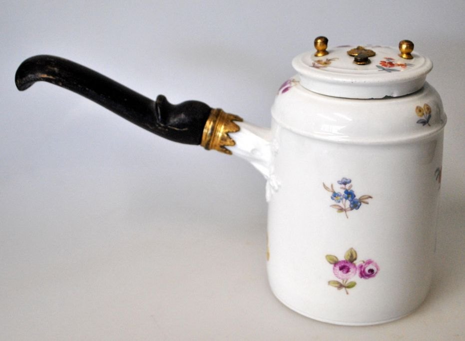 Lille chokoladekande af porcelæn, Frankenthal, ca. 1760, Tyskland. Håndmalet. Dekoreret med strøblomster. Med stjært i sortmalet egetræ. Metal montering med forgyldt messing. Højde.: 11,5 cm. Ustemplet.