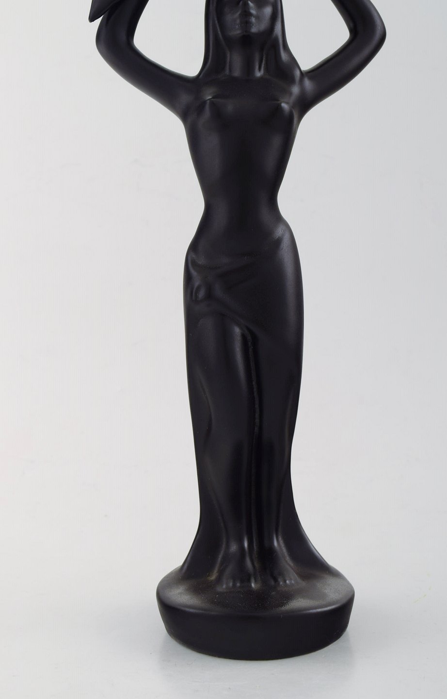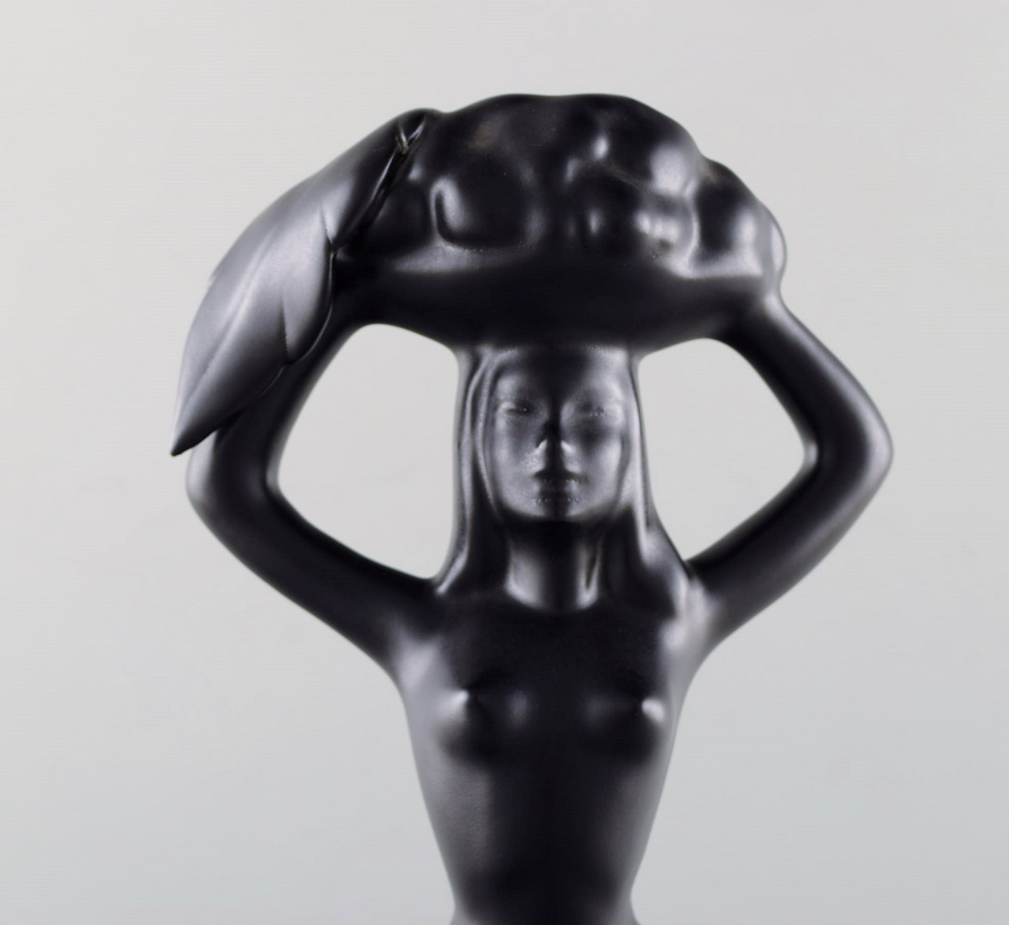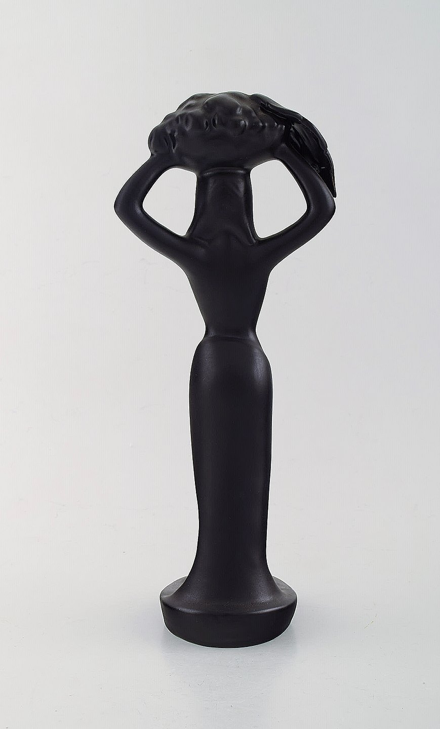 Skandinavisk keramiker. Skulptur i sortglaseret keramik. Kvinde bærer kurv. 1960'erne.