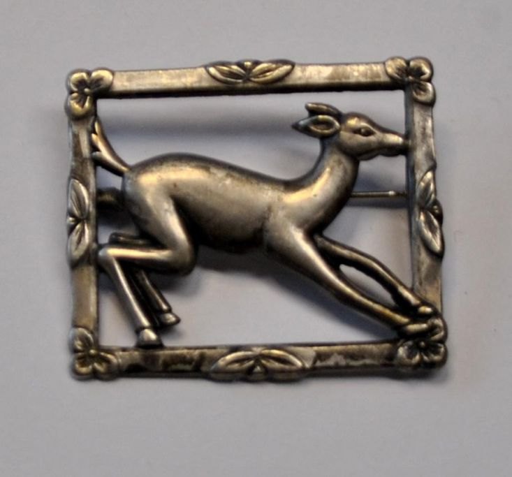 Sterling brosche, 20. årh. Dekoration med springende hjort. Stemplet. 2,8 x 3,2 cm.