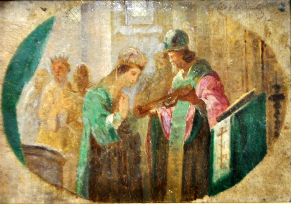 Antagelig motiv fra den russiske zar familie, hvor zarinaen får den kirkelige velsignelsen. Zaren kan ses i baggrunden med krone. Antagelig historisk fremstilling - skitse - til et større værk.