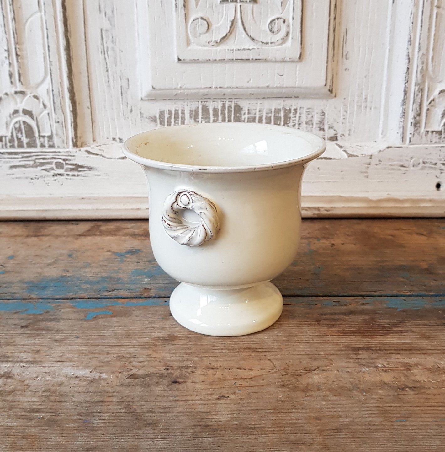 Cremefarvede keramik vase på fod med hanke.