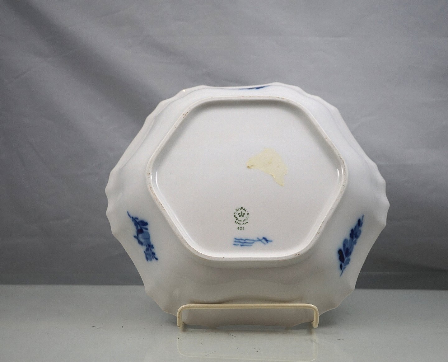 Royal Copenhagen Svejfet Blå blomst, nr. 121, sekskantetfad med flettet-kant.