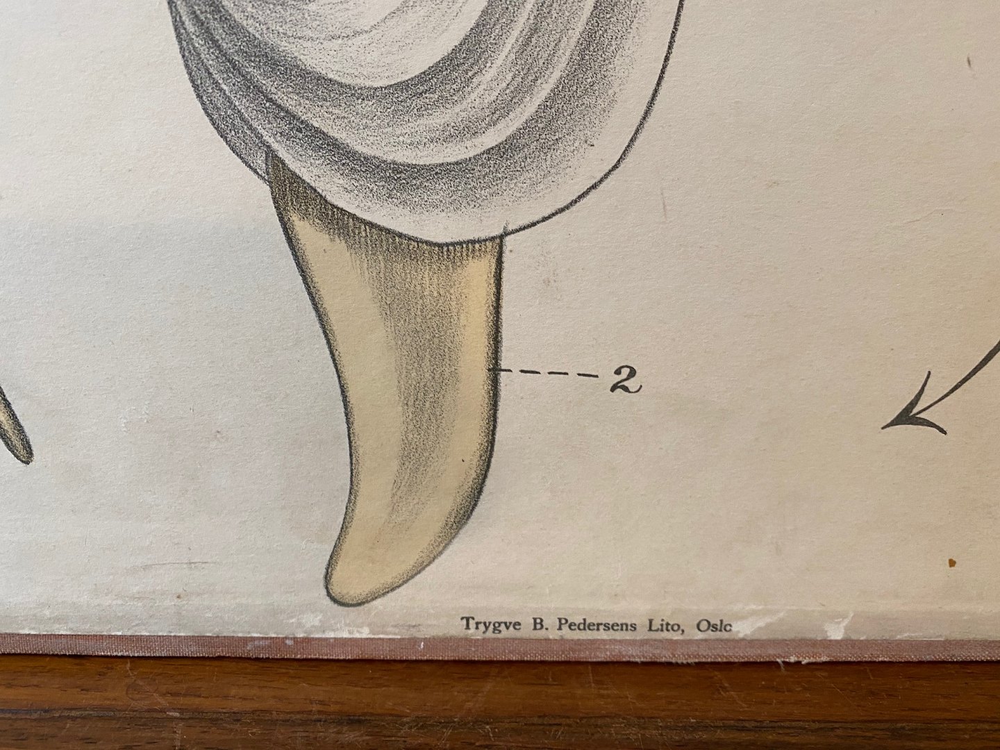 Skoleplanche med snegl, DKK 350,00, norsk fra Dybdahls Zoologiske plansjer, trykt i Oslo i midten af det 20. århundrede.