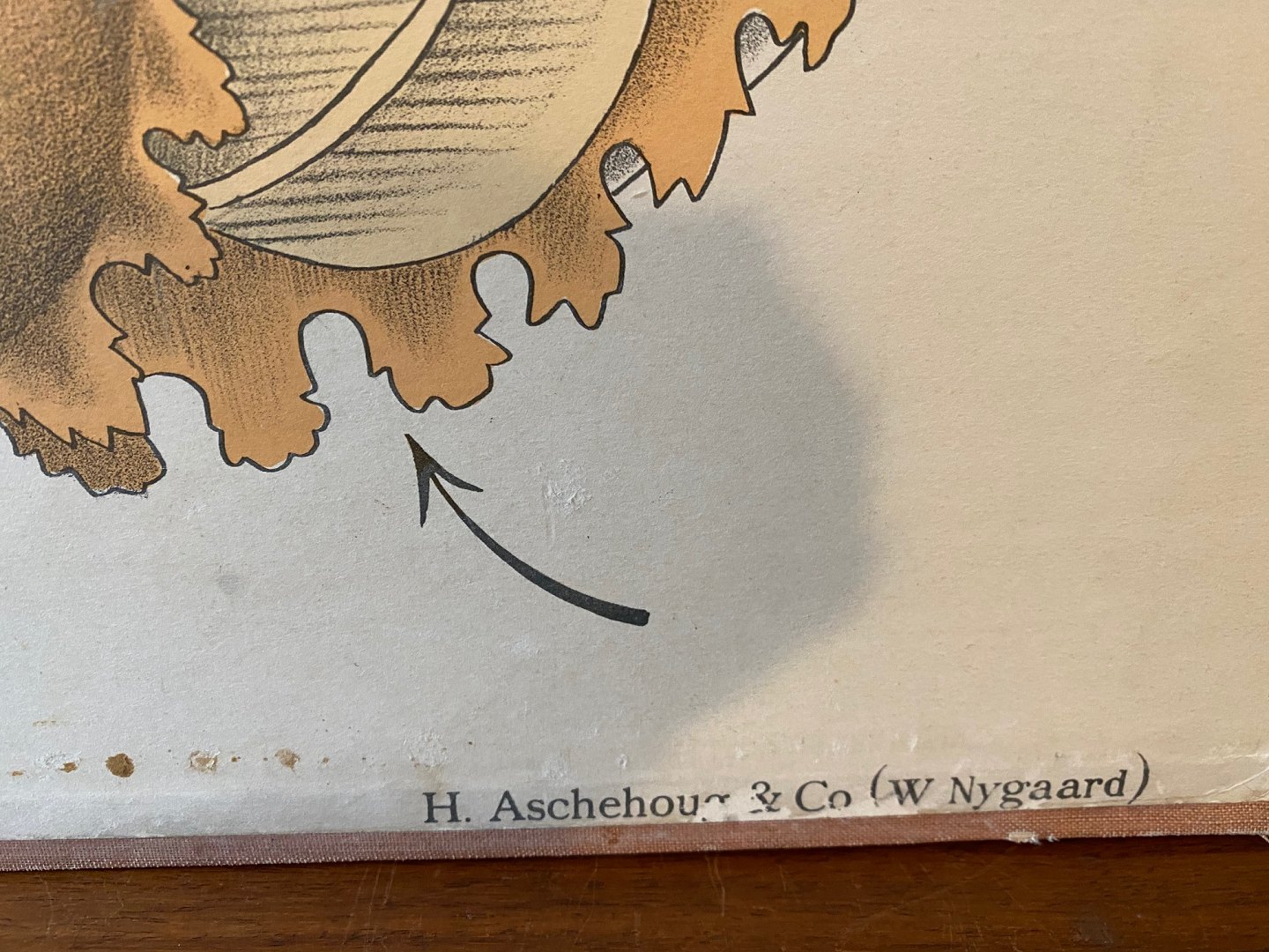 Skoleplanche / zoologisk planche med snegl. Måler ca. 60 x 76 centimeter med ophæng i form af snor. God vintage stand med patina - se fotos. Cirka 1950'erne. Kan desværre ikke sendes, men skal afhentes i butikken på Vesterbrogade 177, 1800 Frederiksberg C.