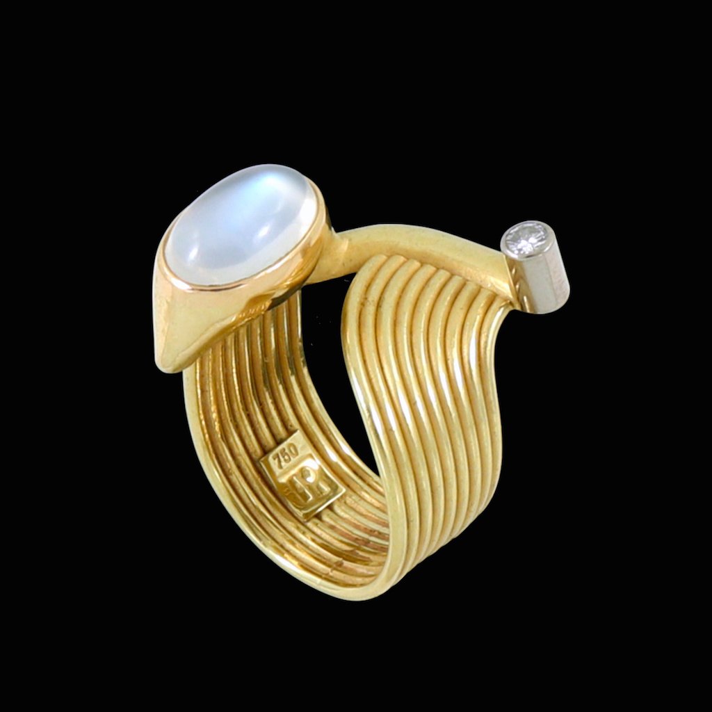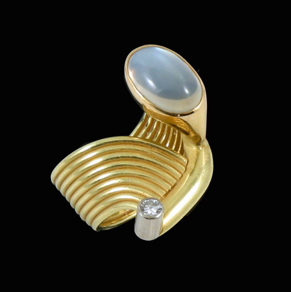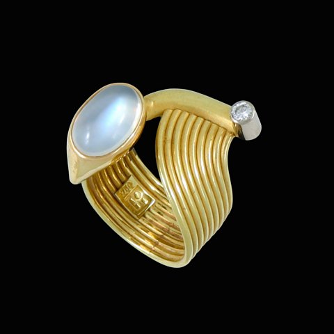 Dansk Design. Ring i 18k guld & hvidguld med månesten og diamant 0.15ct.