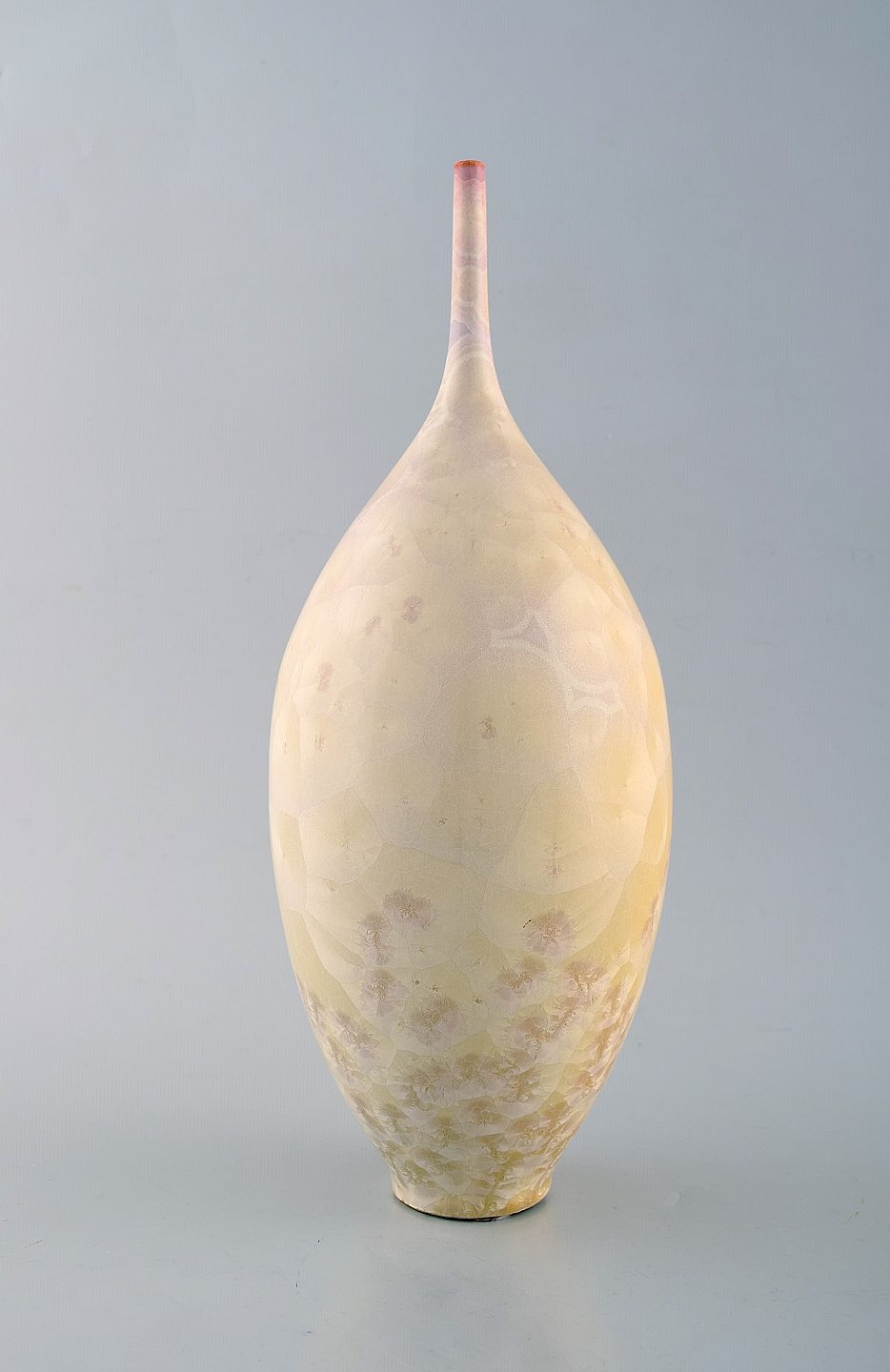 Isak Isaksson, svensk keramiker. Stor smalhalset unika vase i glaseret keramik. Smuk krystalglasur. Eget værksted, ca 2010. Samtidskeramik i høj kvalitet.
