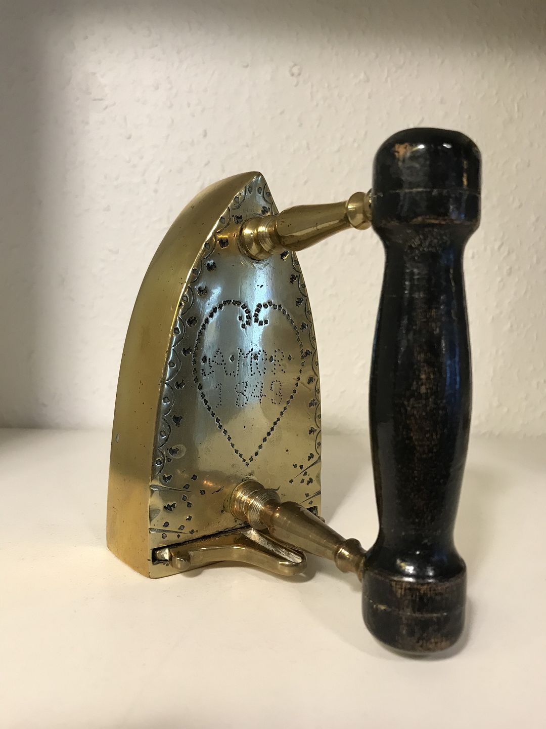 Messing strygejern med hjerte dekoration. AMOR 1843.