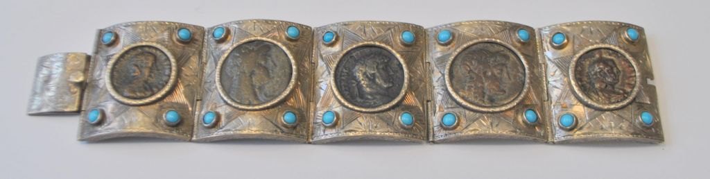 Arm smykke i sølv med indfattede turkiser og 5 antikke bronze mønter, Israel, 20. årh.