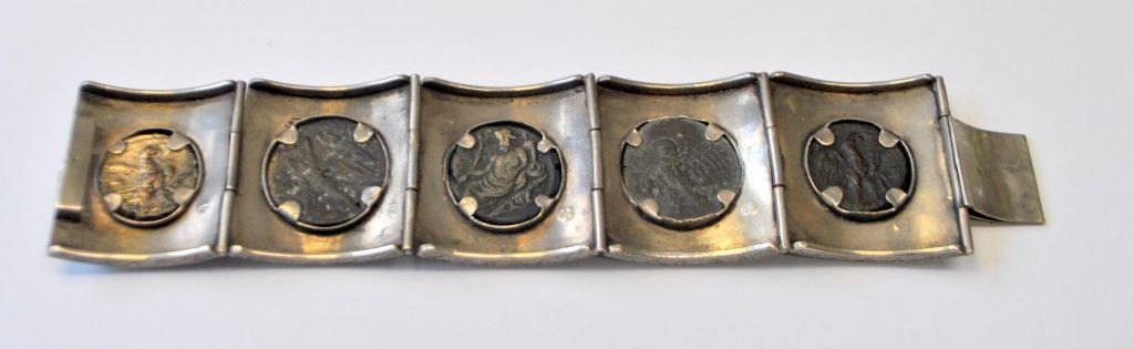 Arm smykke i sølv med indfattede turkiser og 5 antikke bronze mønter, Israel, 20. årh. Stemplet. Armbåndet dekoreret med mønstre. L.: 20,5 cm. Vægt: 130 gram.
