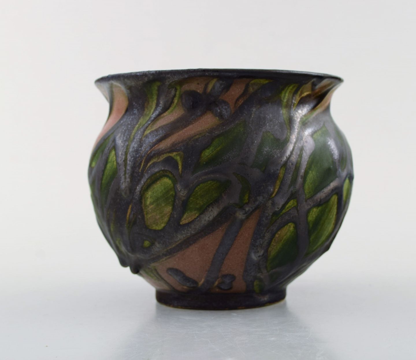 Kähler, HAK, glaseret stentøjsvase i moderne design. 1930/40´erne. Kohornsteknik. Blade og grene på brun baggrund.