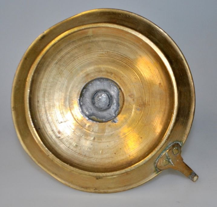 Dansk kammerstage i messing, 19. årh. Rund skål med håndtag. Stamme med streg dekoration. H.: 12,8 cm. Dia.: 12 cm.