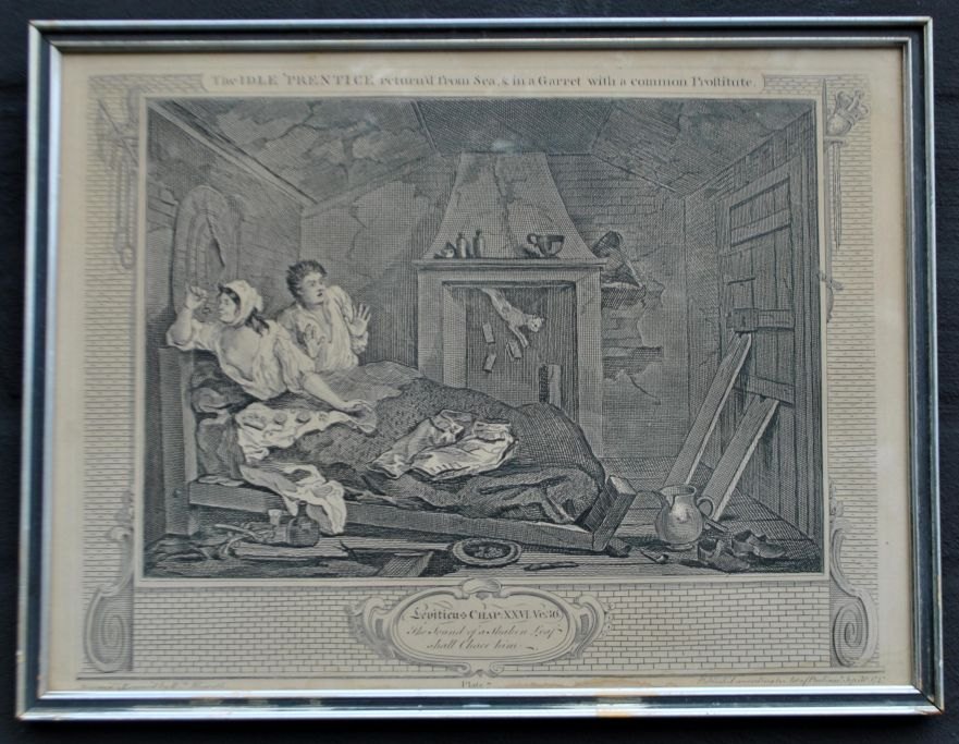 Hogart, William (1697 - 1764) England: The idle prentice returned from sea & in a Garret with a common Prostitute. Signed. 28 x 36.5 cm. Printed in 1747.