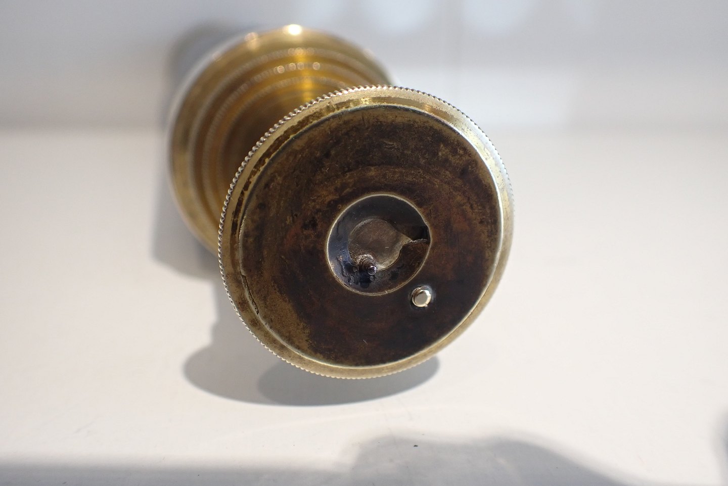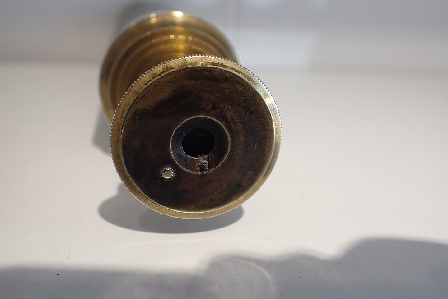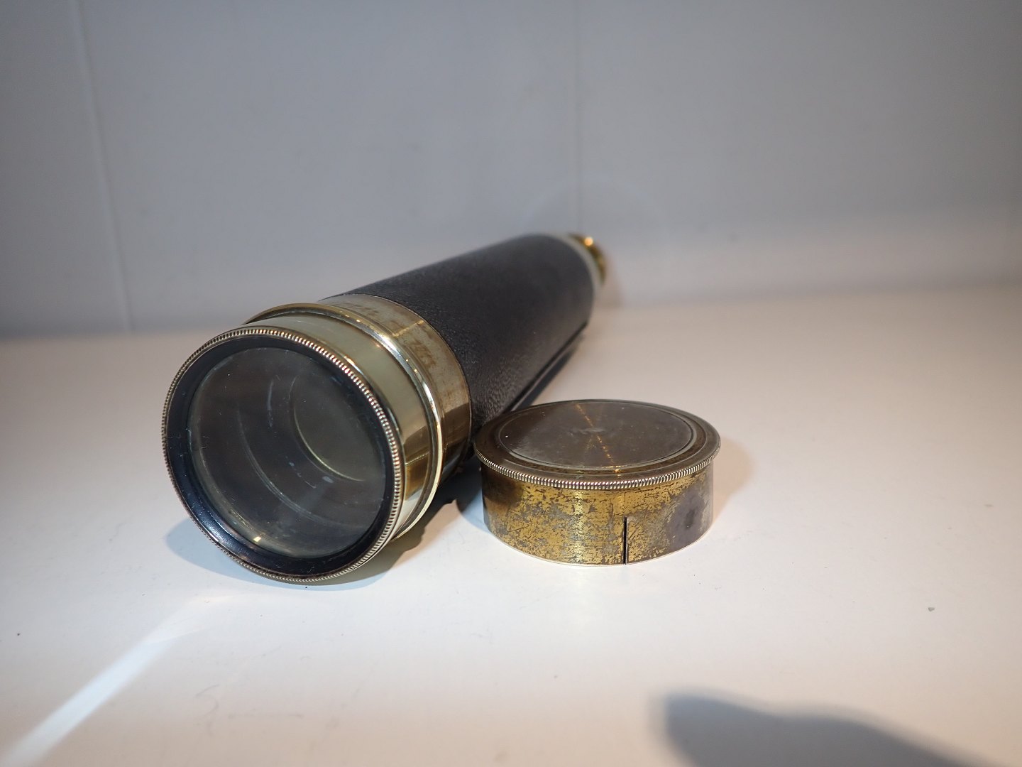 Lille engelsk søkikkert i messing og læder - 3 draw. 57 cm. fuldt udtrukken og cm. trykket sammen. I pæn stand med aldertypisk brugslid. Fungerer. Ca. 1900