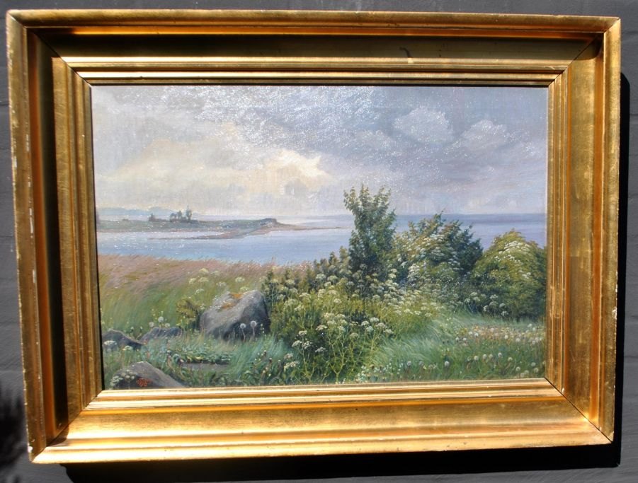 Matthiessen, Hjalmer (1880 - 1957) Danmark: Motiv fra Horsens fjord. Motiv fra Snaptur mod Hjarnø. Hvide skærmplanter. Olie på lærred. Signeret monogram 1909. 49,5 x 74 cm.