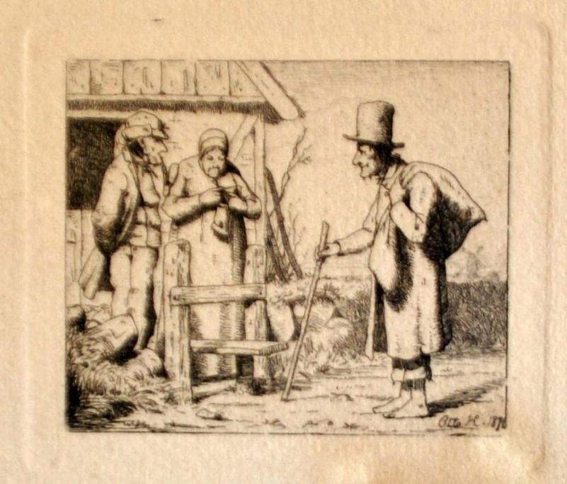 Haslund, Otto (1842 - 1917) Danmark: En kræmmer kommer på besøg. Signeret 1876. 8 x 9,5 cm.