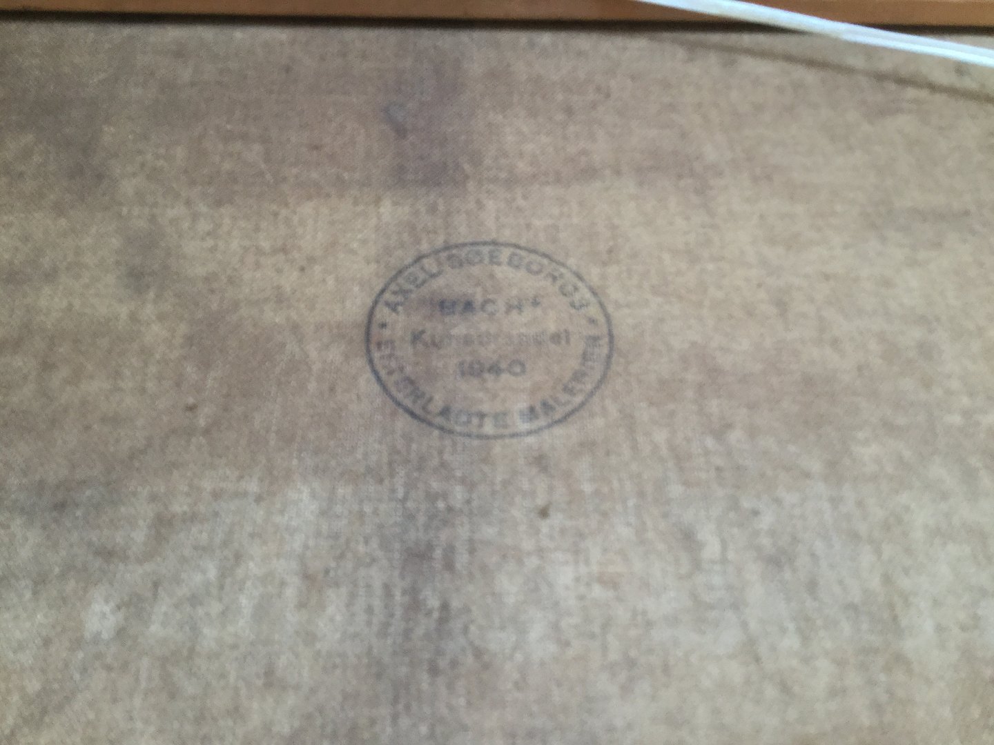 Bagpå lærred stempel fra "Salg af Axel Søeborg's efterladte malerier 1940 Bach's Kunsthandel"