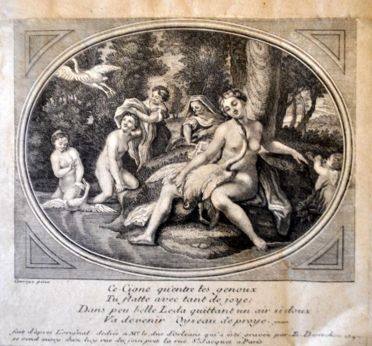 French artist (18th century) Leda with the Swan. Engraving. 9 x 11.5 cm.