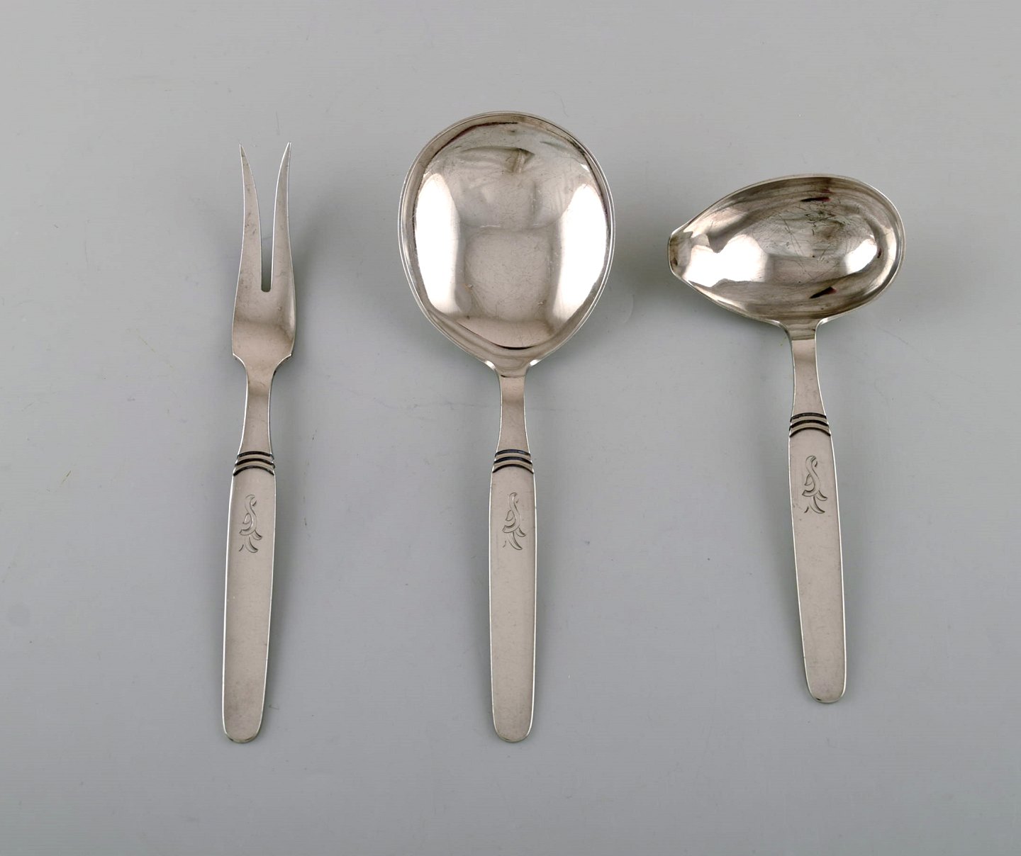 Bestående af tolv middagsgafler, tolv middagsknive, tolv spiseskeer, kødgaffel, serveringsske og sauceske.