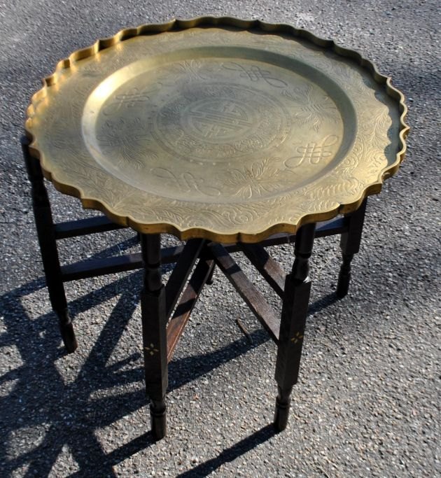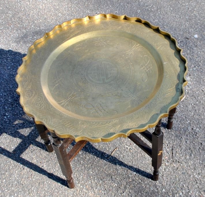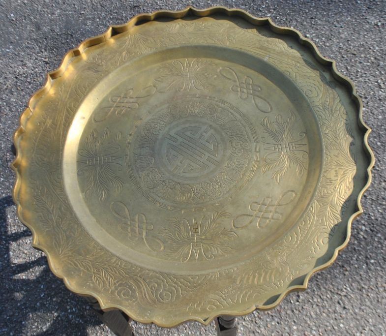 Kinesisk rygebord, ca. 1900. Understel af træ med intarsia. Bordplade i messing med dekorationer af blomster, fasaner og tegn. Med bølget kant. Stemplet: China. Dia. plade: 55,5 cm. Højde bord: 47 cm.