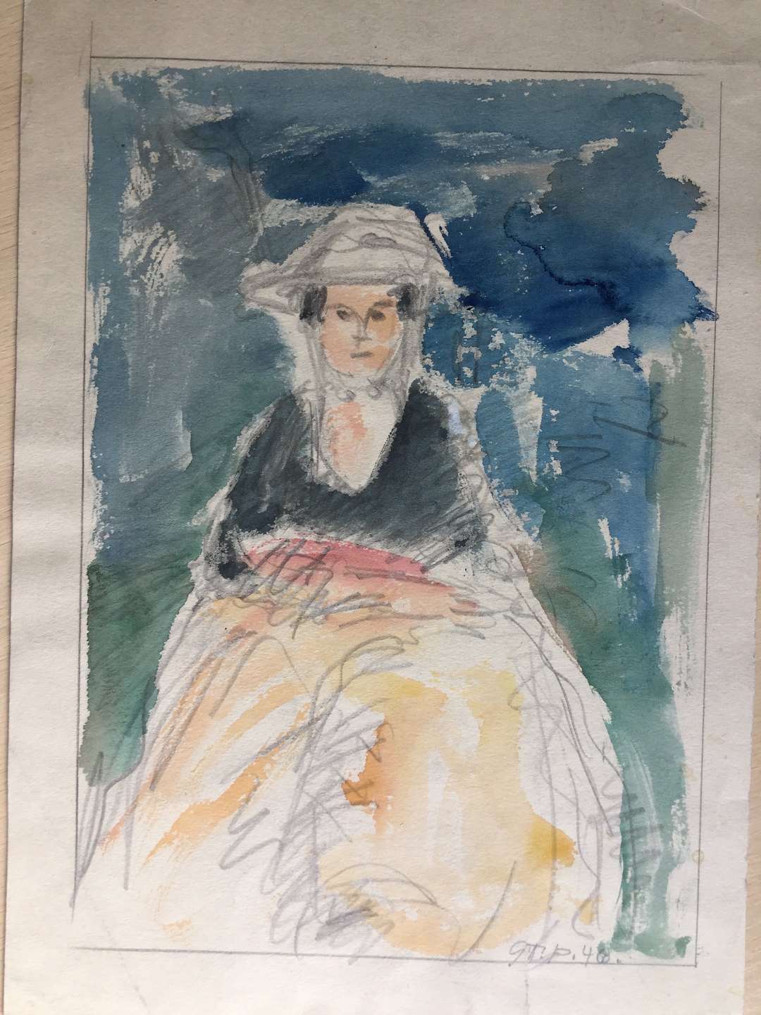 Bagpå akvarel af siddende kvinde 1946