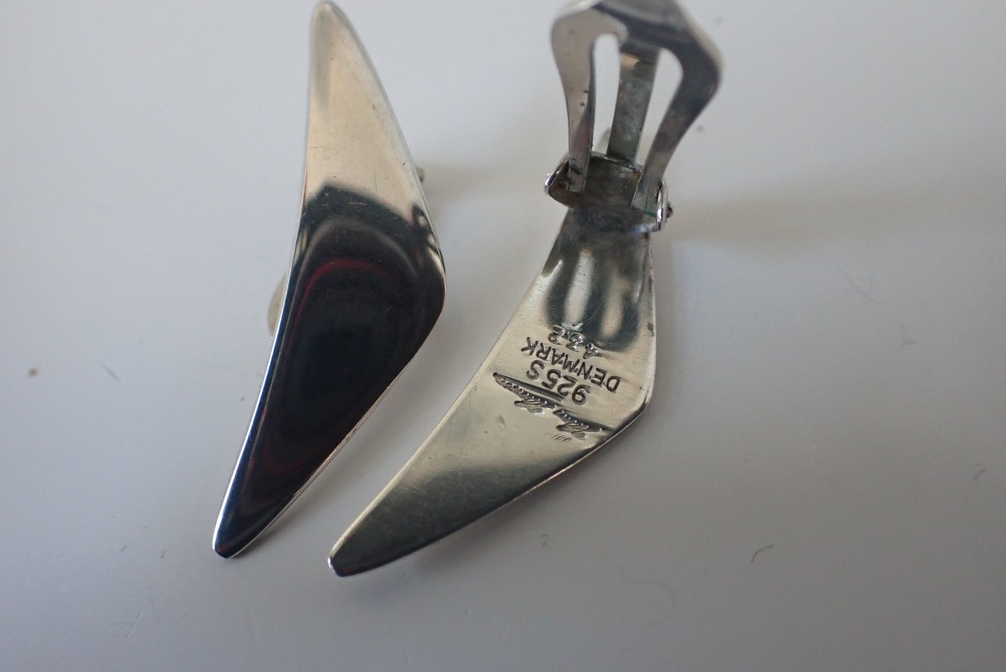 "Peak" øreclips i sterling sølv, designet før 1969 af Bent Gabrielsen (1928 - 2014) - dessin. 432 for Hans Hansen(1884 - 1982) udført i 1970-erne. Længde: 2,5 cm. Bredde: 1 cm. Vægt: 6,7 gram. I fin stand med let brugsslid. Solgt.