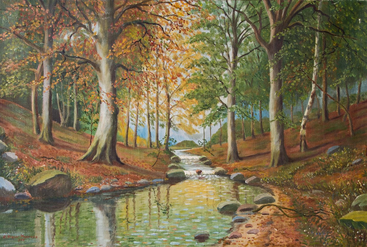 Naturmaleri med motiv af løbende bæk i skovområde
