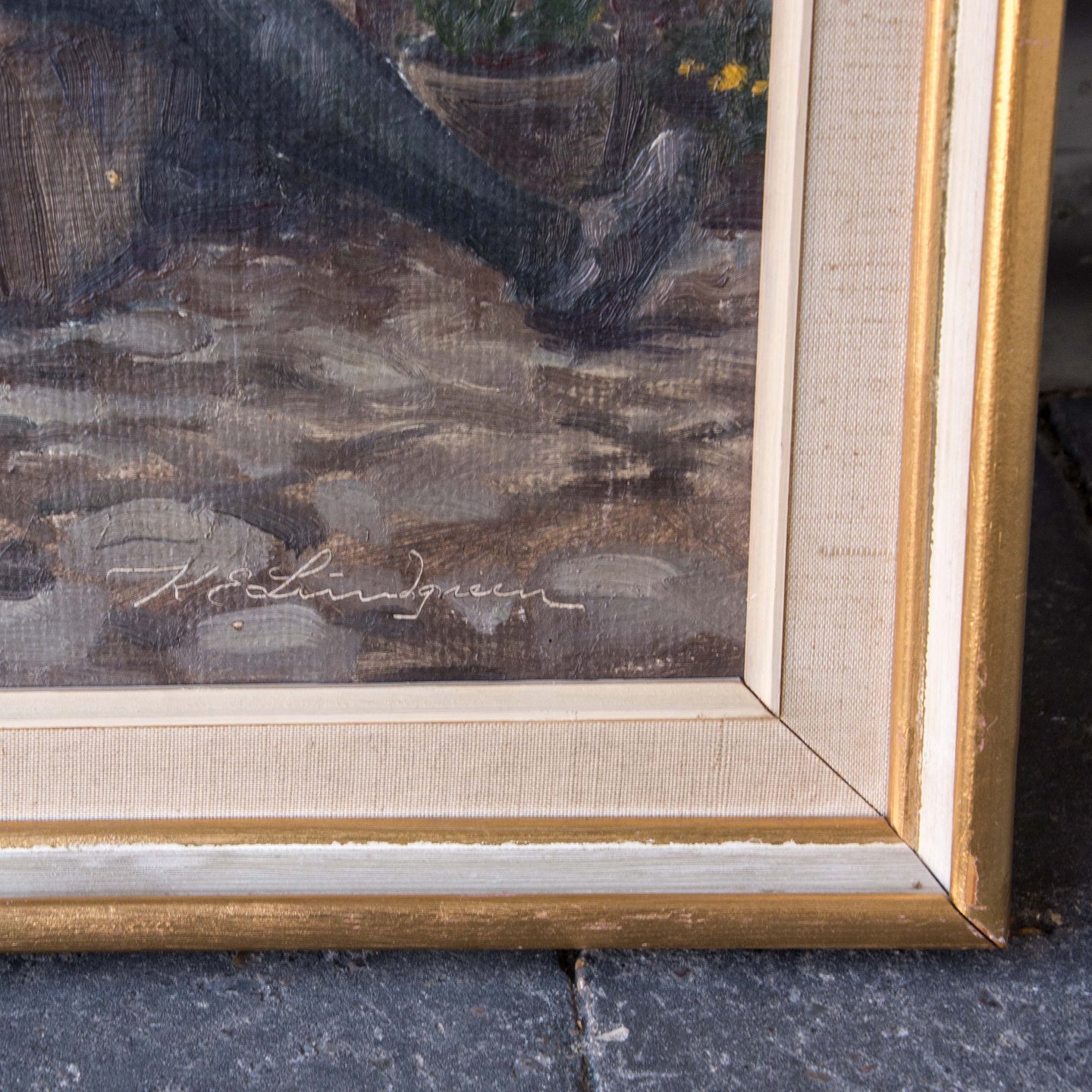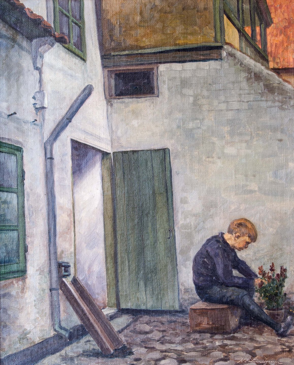 Maleri af barn uden for hus, olie på lærred.