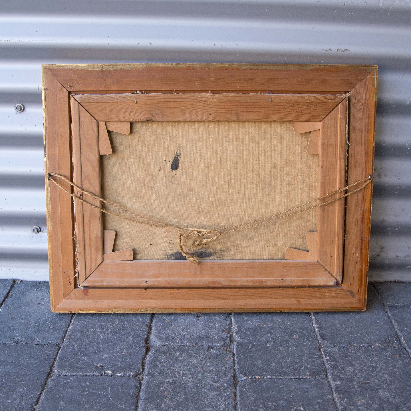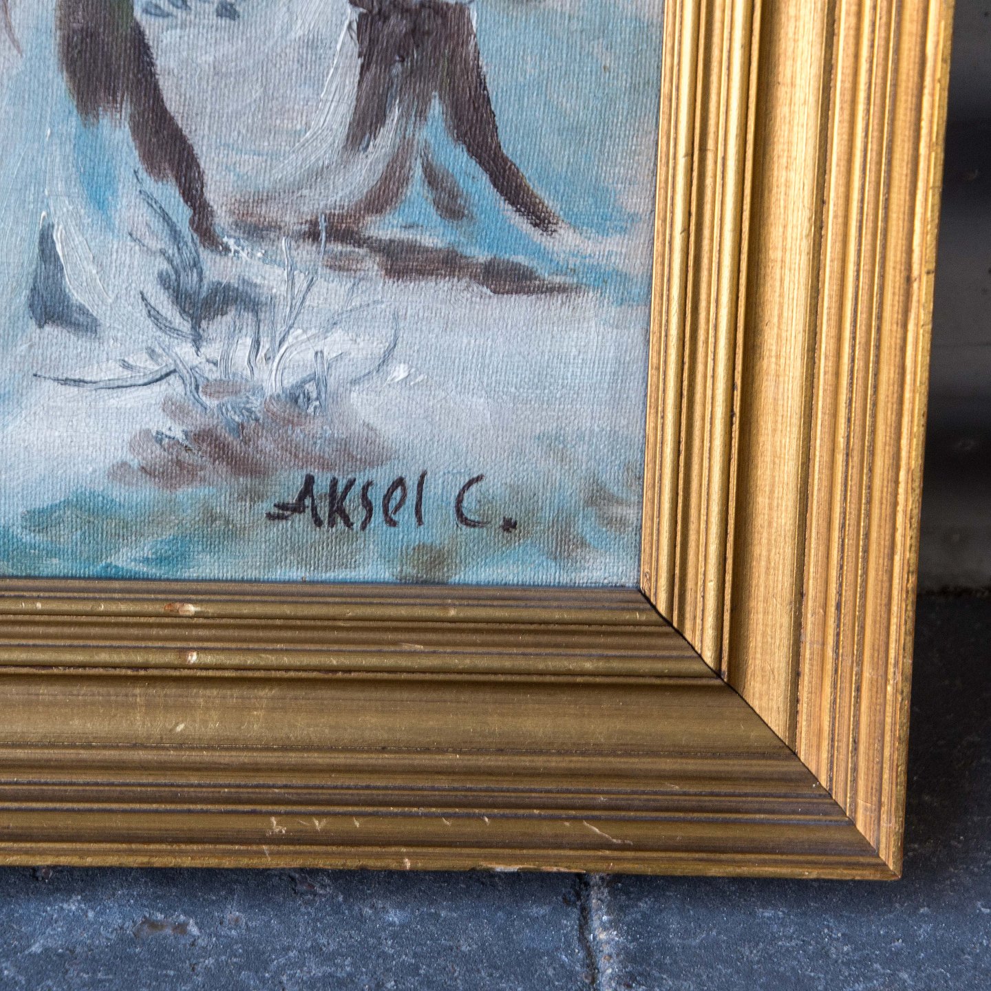 Landskabmaleri med naturmotiv af snedækket landskab ved sø