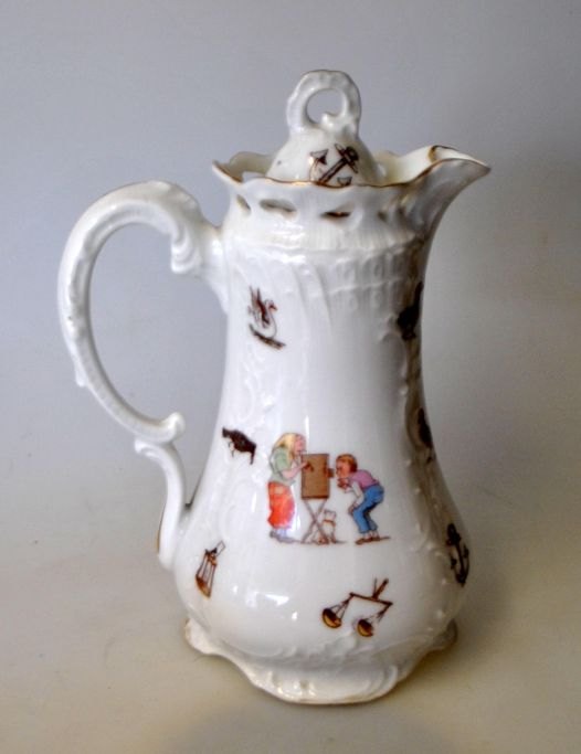 Børne kaffe service i porcelæn, ca. 1900, CT Altwasser. Tyskland. Hvidt porcelæn med dekorationer i overføringsteknik. Stemplet. Kaffekande højde.: 17 cm.