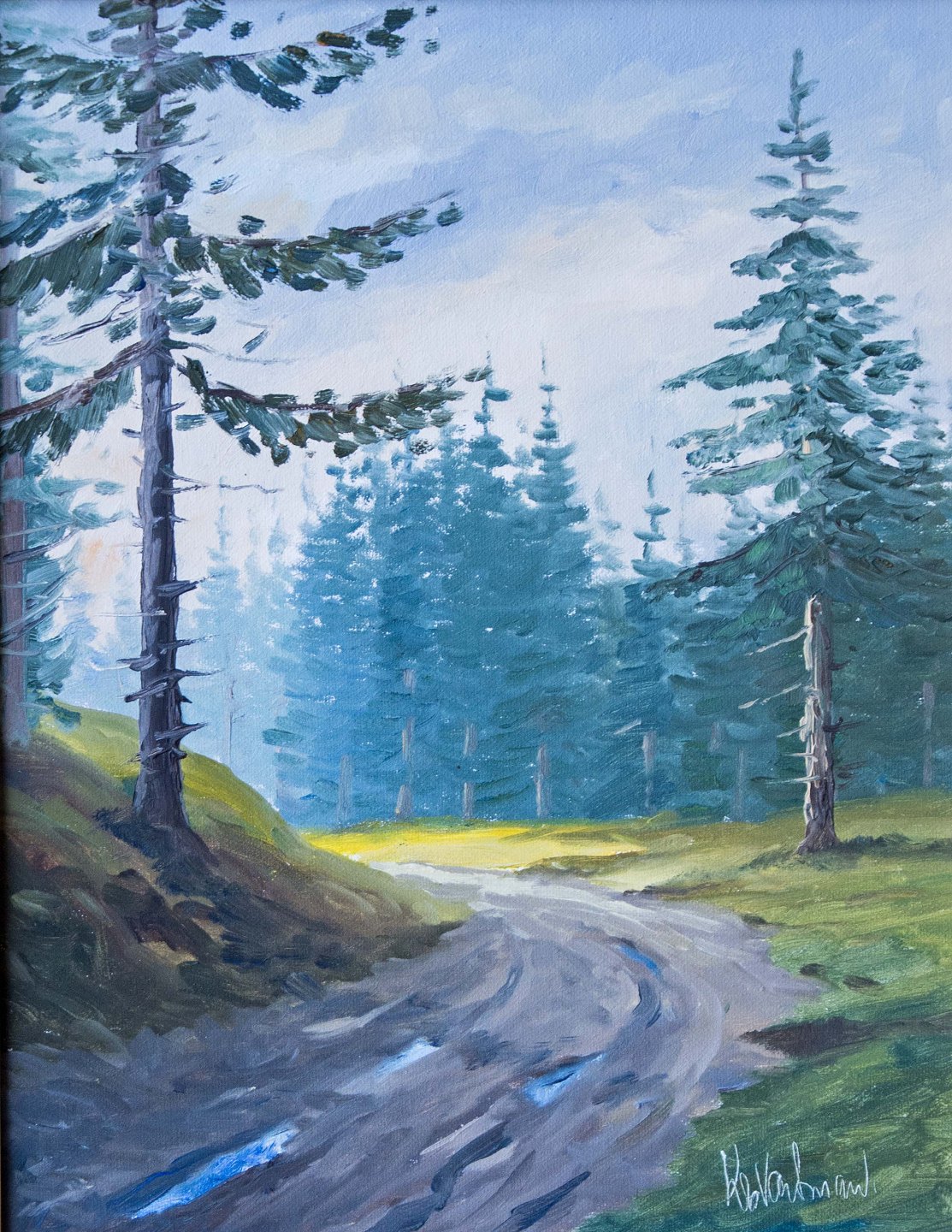 Landskabsmaleri med naturmotiv af skovvej omgivet af grantræer