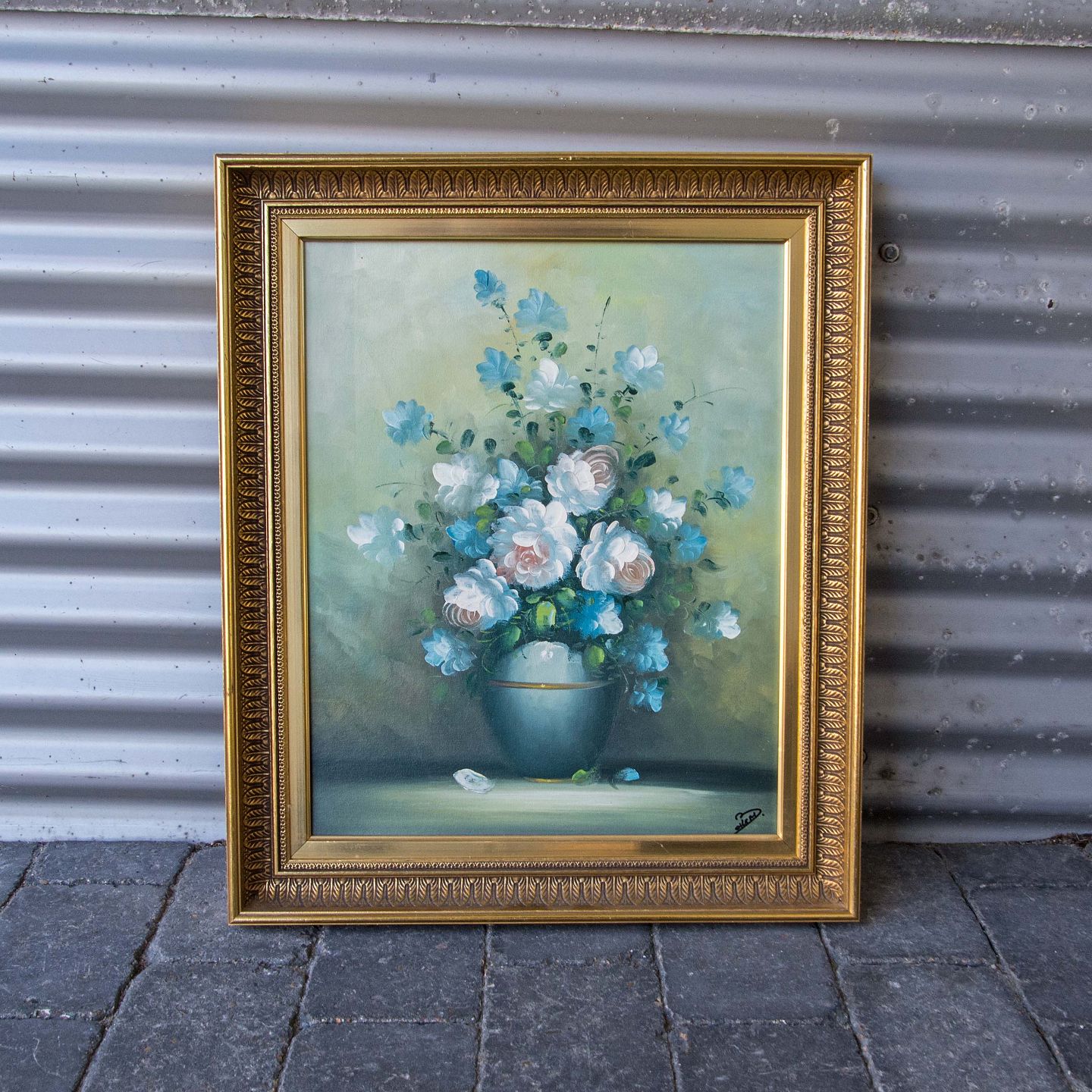 Stillebenmaleri med motiv af cremefarvede roser i vase