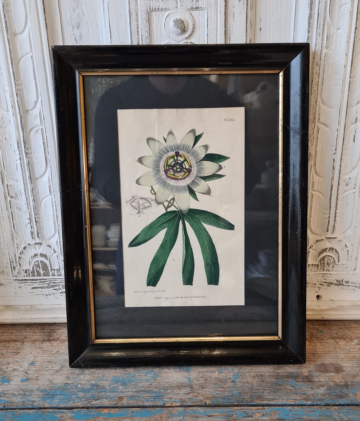 1800tals håndkoloreret botanisk tryk med passionsblomst i smuk gammel sort ramme med smal sølvkant.