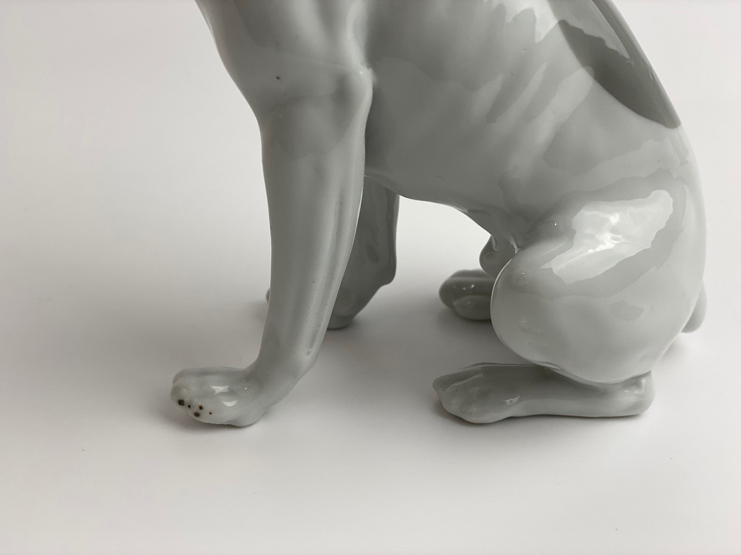 Hundefigur fra Fritz og Ilse Pfeffer, Gotha, Tyskland. Figuren er produceret imellem år 1900 og 1934. Højde ca. 15,70 centimeter. Rigtig fin stand. Bemærk brændingsfejl i form af prikker på en af poterne.