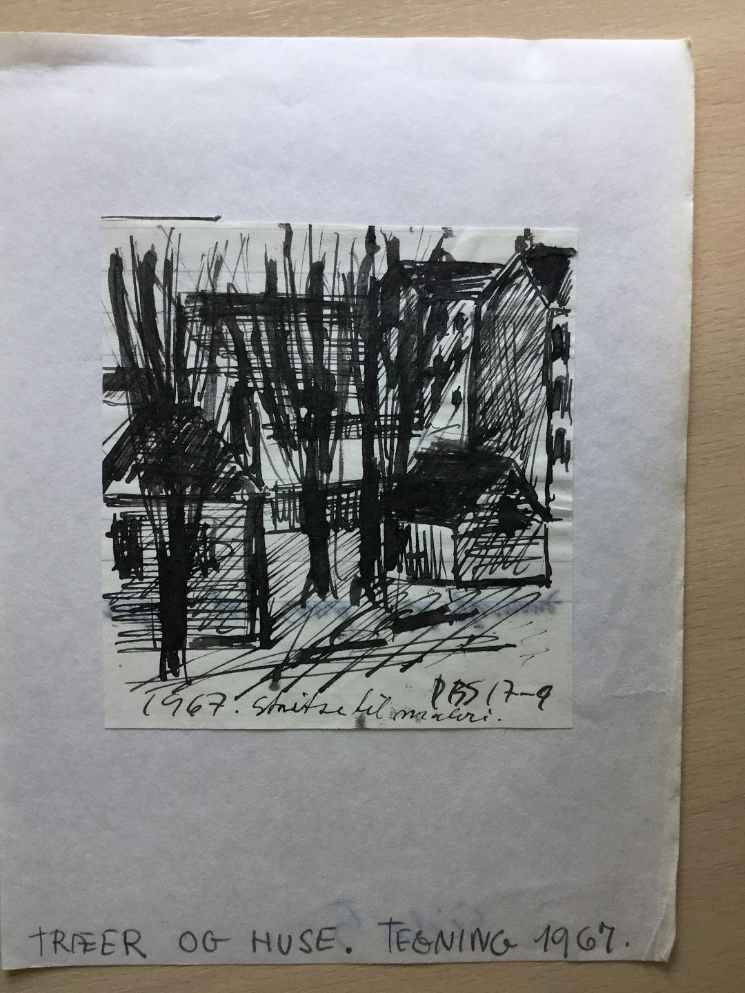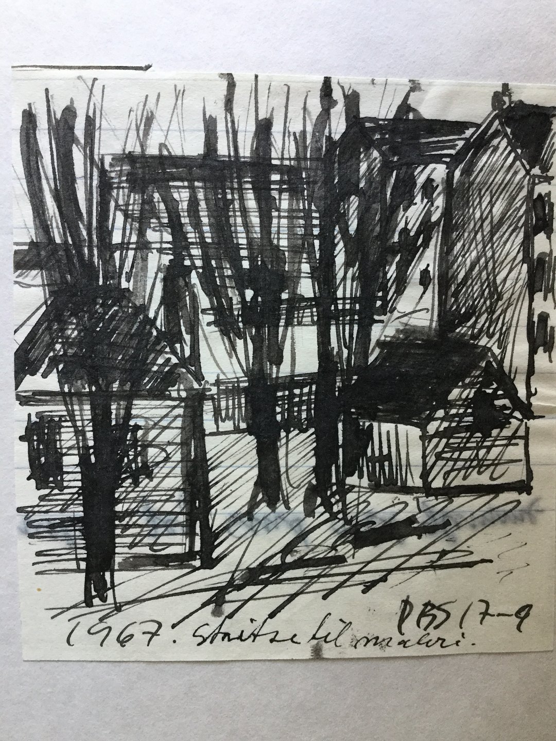 Tegning af Peder Brøndum Sørensen - Træer og huse 1967.