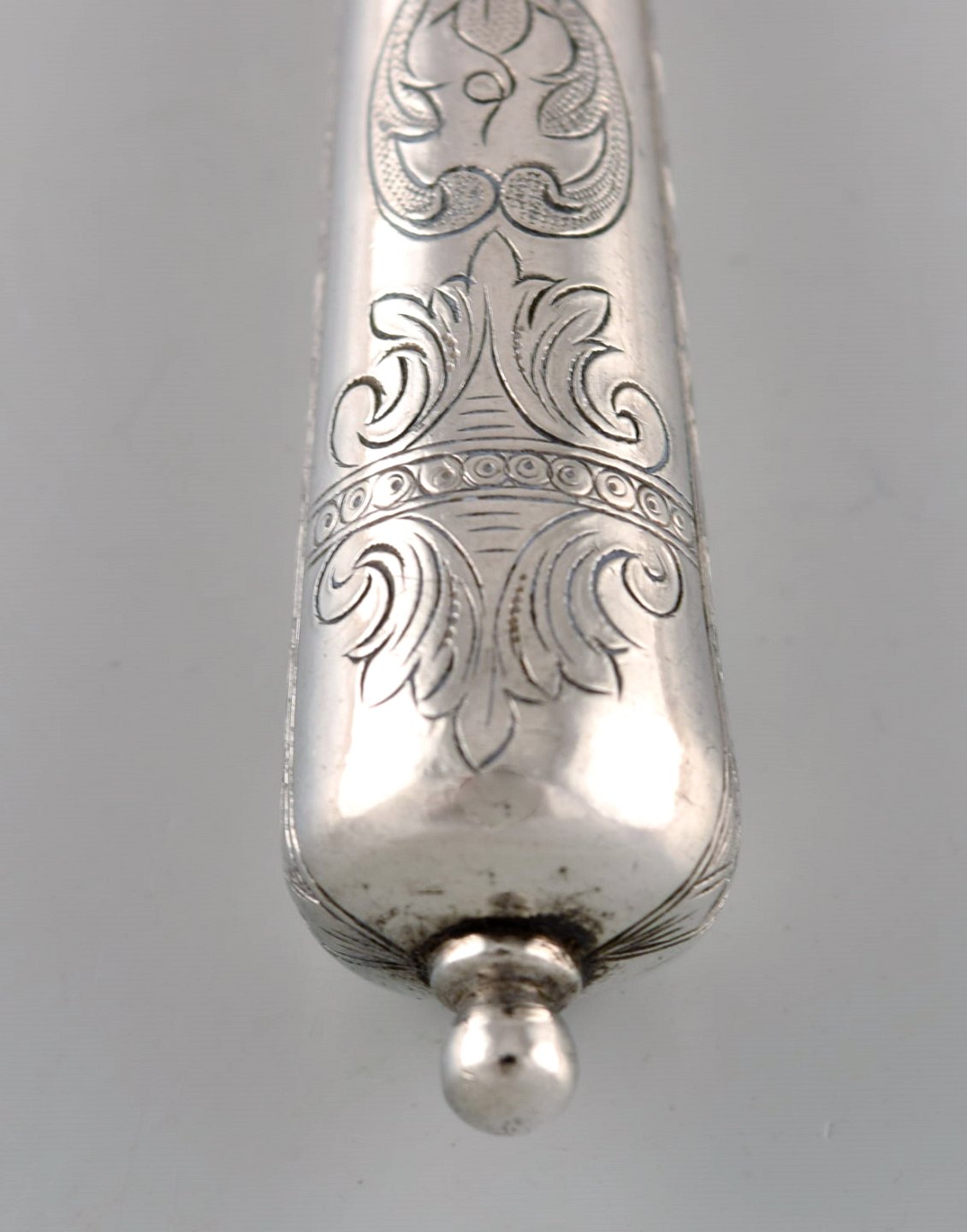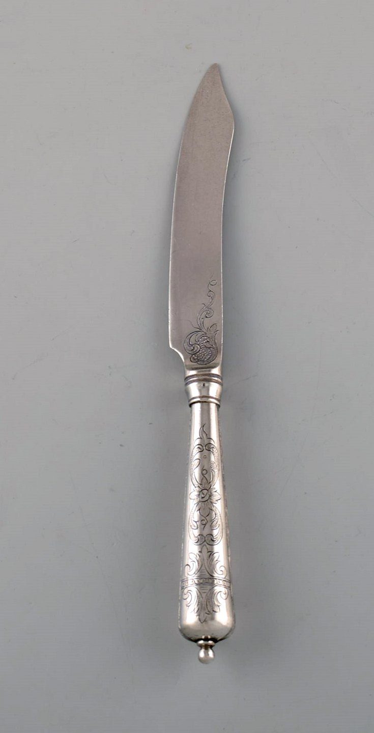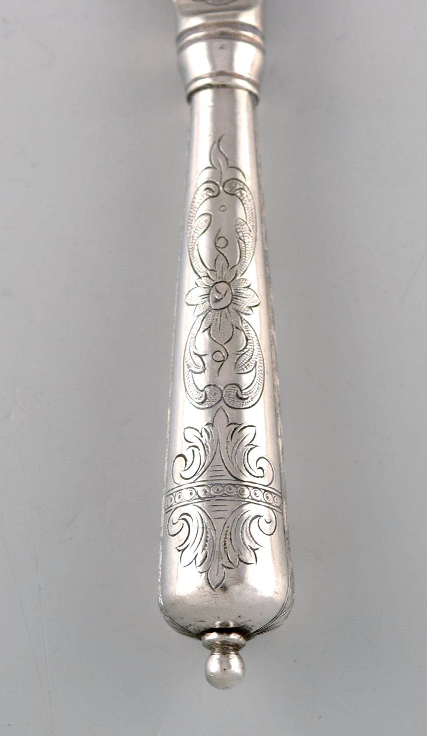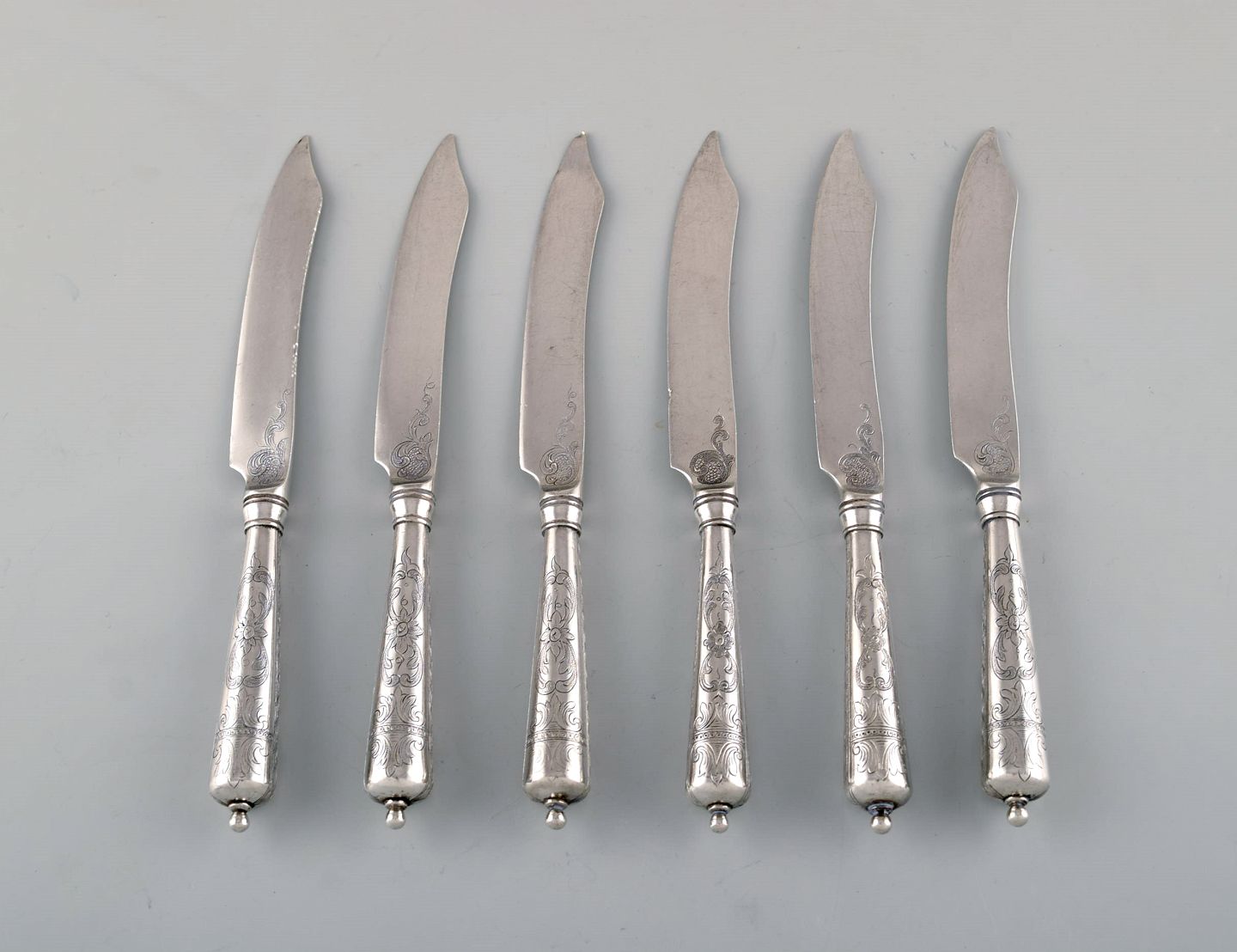 Dansk sølvsmed. Seks antikke knive i tretårnet sølv med blomster ciseleringer. Dateret 1918.