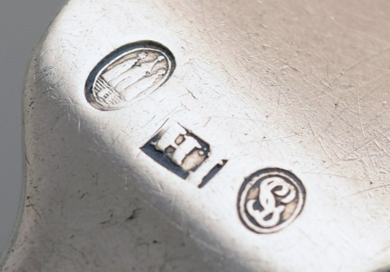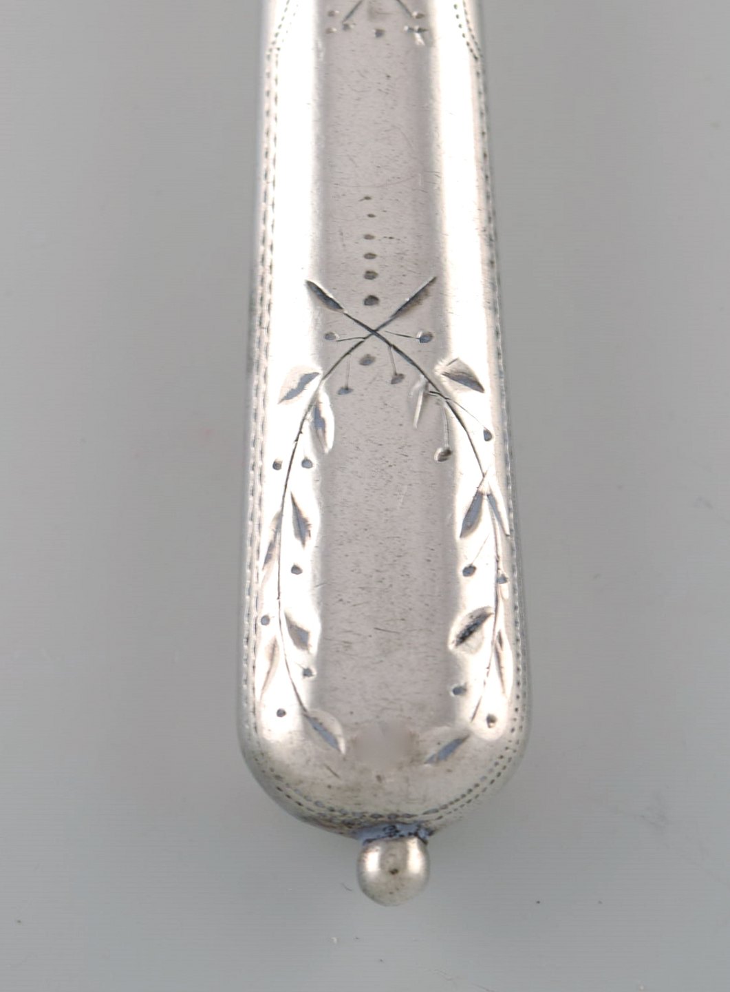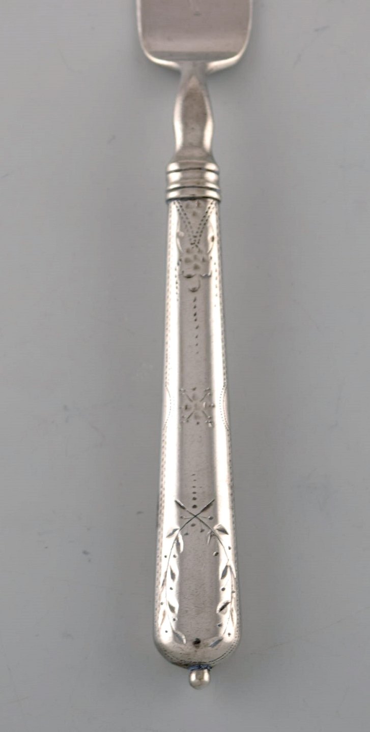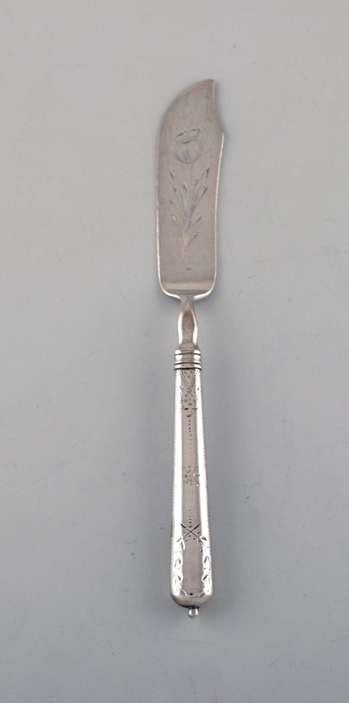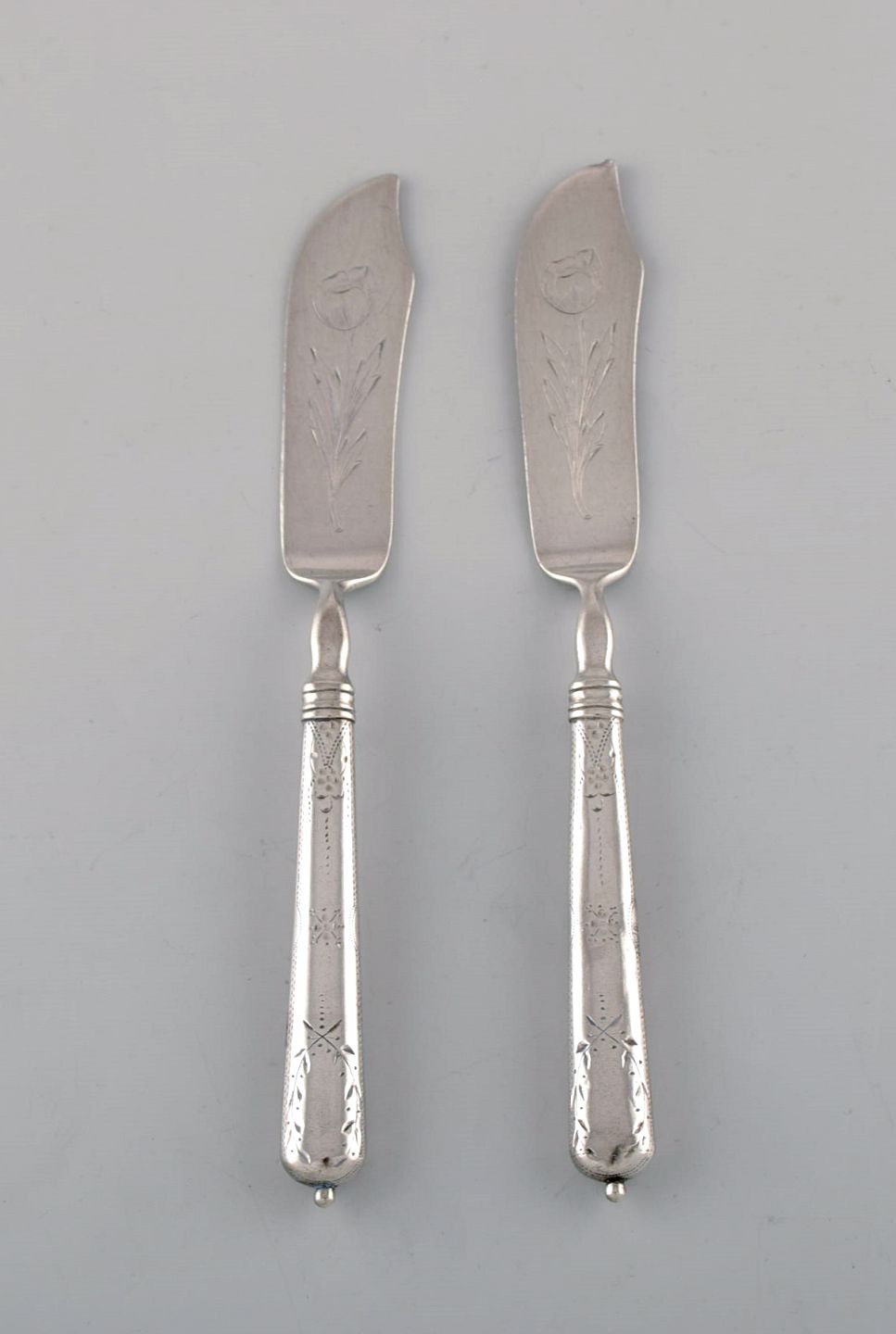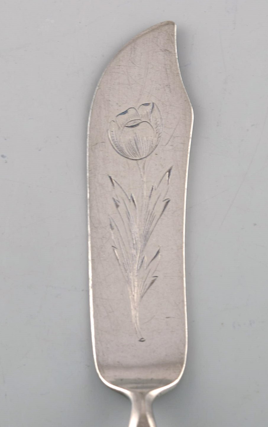 Dansk sølvsmed. To antikke fiskeknive i tretårnet sølv med blomster ciseleringer. Dateret 1918.