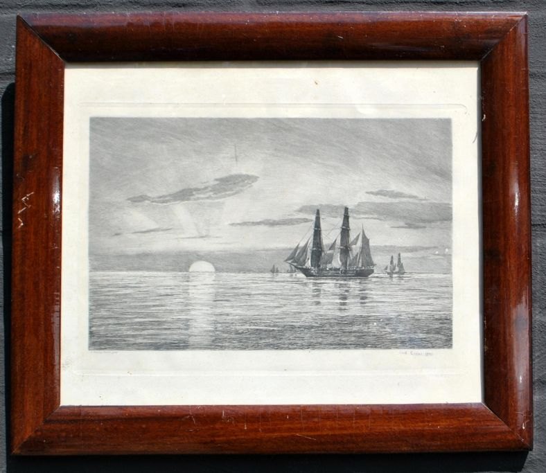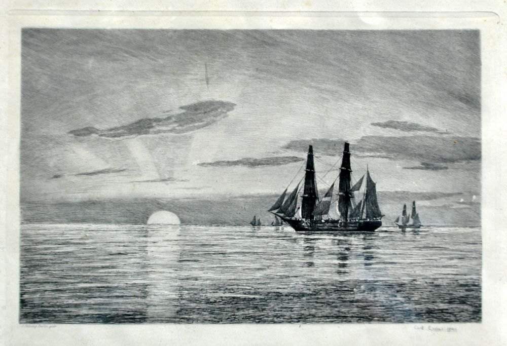 Locher, Carl ( 1851 - 1915) Danmark: Sejlskibe på havet. Radering. Signeret 1893. 23 x 33 cm.