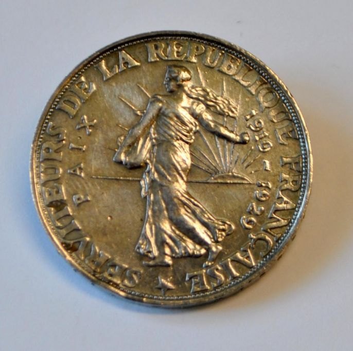Møntbrosche i sølv, 1929. Frankrig. Med portrætter på bagsiden af Clemenceau, Poincart og Briand. Dia.: 3,5 cm. Med nål.